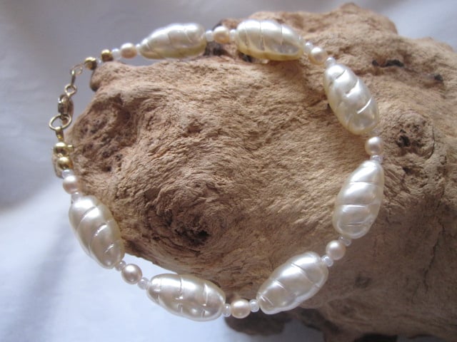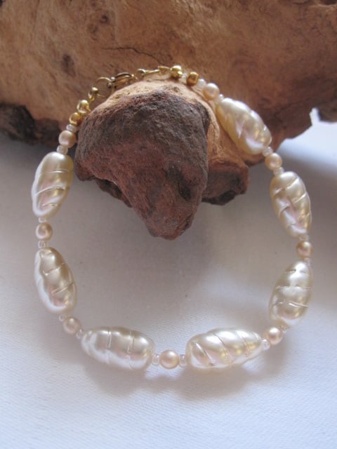 A light weight bracelet made using glass imitation pearl effect beads. The oval beads have a groove/twist effect and are approx. 1.5cm x 0.8cm. There are also small round imitation pearls which are approx. 4mm in diameter. The bracelet is approx. 20cm in length from end to end and is finished off with gold plated findings. The clasp is a bolt clasp.