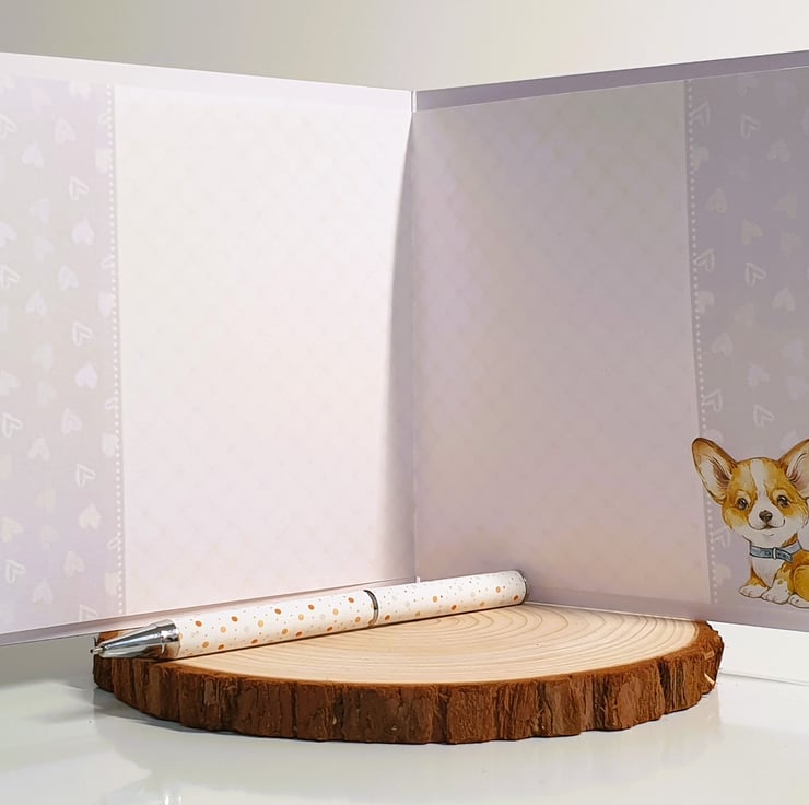The card has been finished with a coordinating double insert that has been left blank, leaving you plenty of space to add your own personal message and wishes. A matching image of a Corgi puppy has been placed on bottom right corner of the insert.