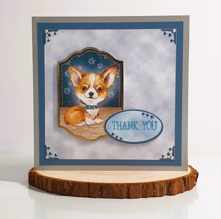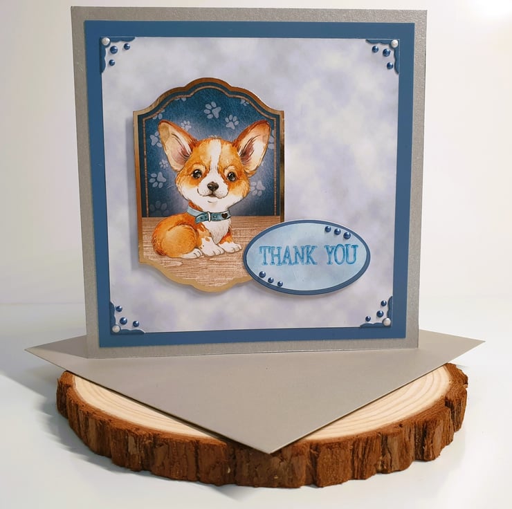 The Corgi puppy image topper and the "Thank You" sentiment, are both mounted on foam pads to give dimension with the 3D effect.