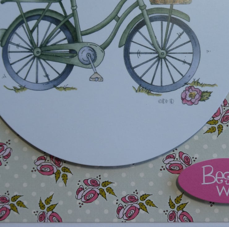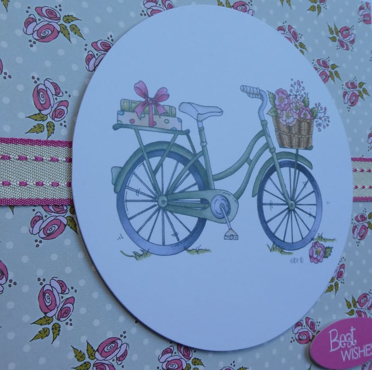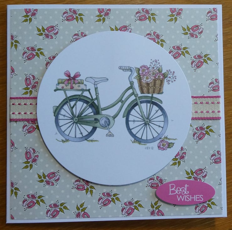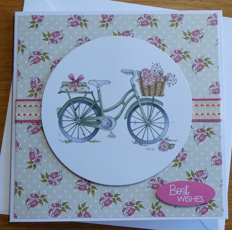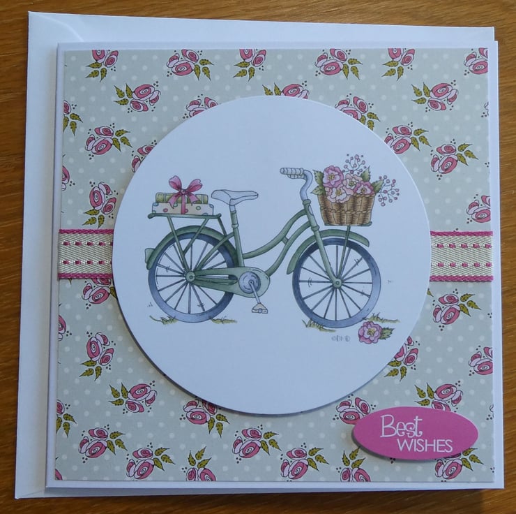 With an image of a bicycle with a basket of flowers and the message Best Wishes this card would be ideal as a Birthday, Mother's Day, Retirement or Bon Voyage card.
