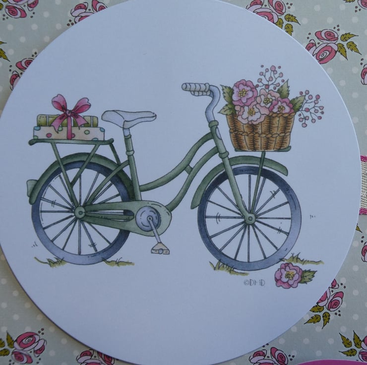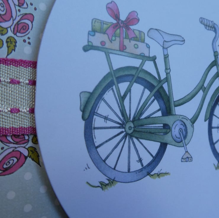 The card has a printed circular image of a green bicycle with a basket of pink flowers on the front and wrapped presents on the back.