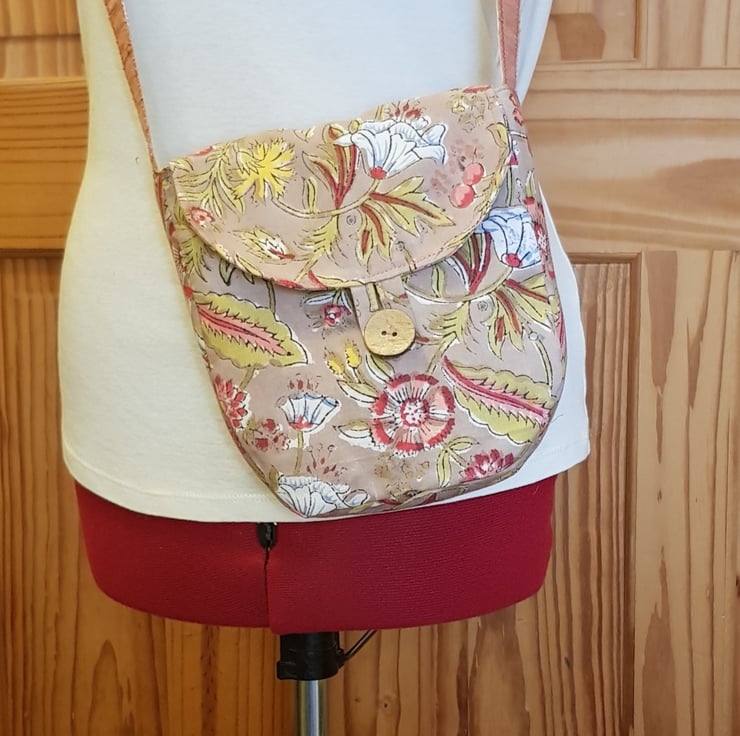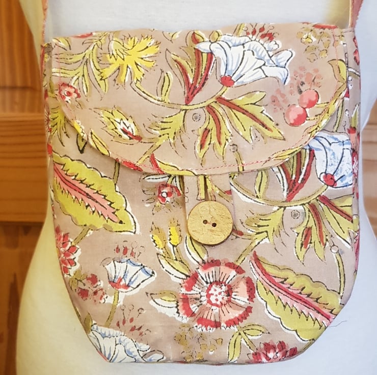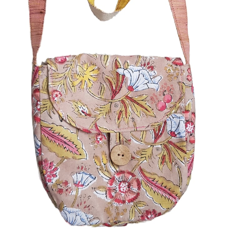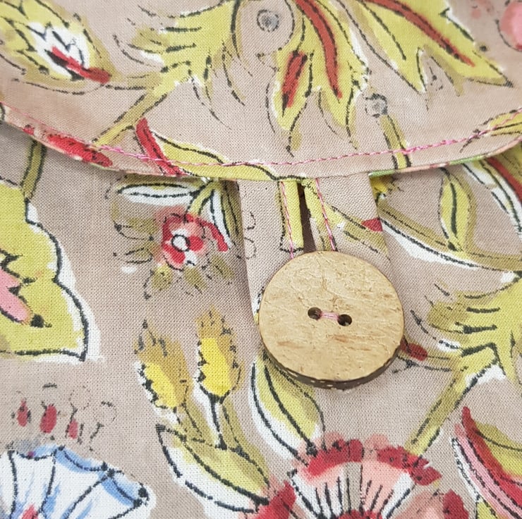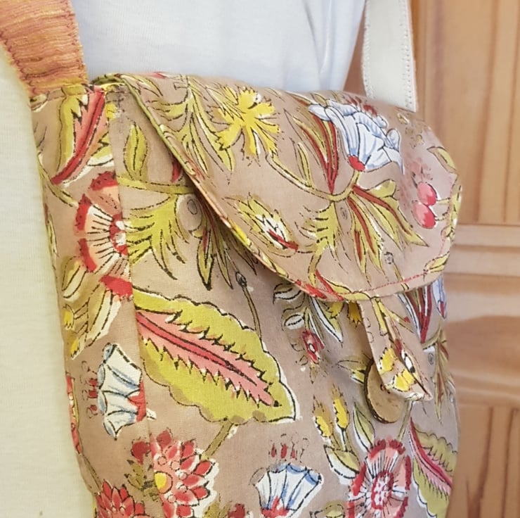 The bag is fully lined with a coordinating block print fabric and I have added small inside pocket. For the straps I have stitched traditional Khadi woven ribbon on to a cotton herringbone tape.