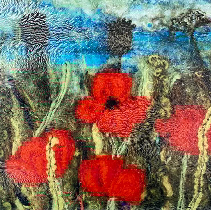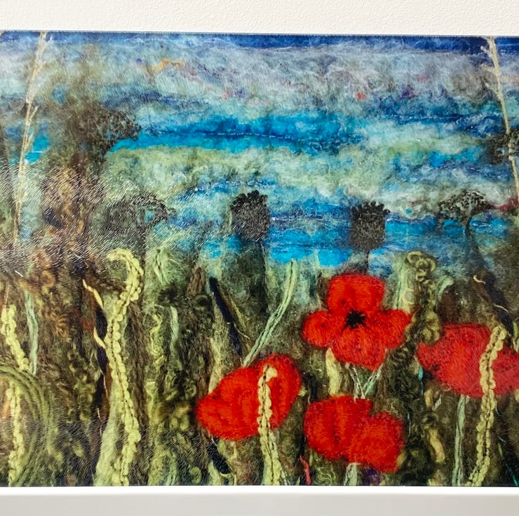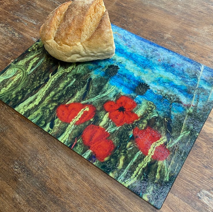 This unique glass chopping board has one of my textile seascapes on it. This one shows the grass banking with poppies at Saltburn. The glass board is heat resistant, makes a perfect cheeseboard, work top saver and a stunning center piece for the table. Easily cleaned. Size A3 landscape.