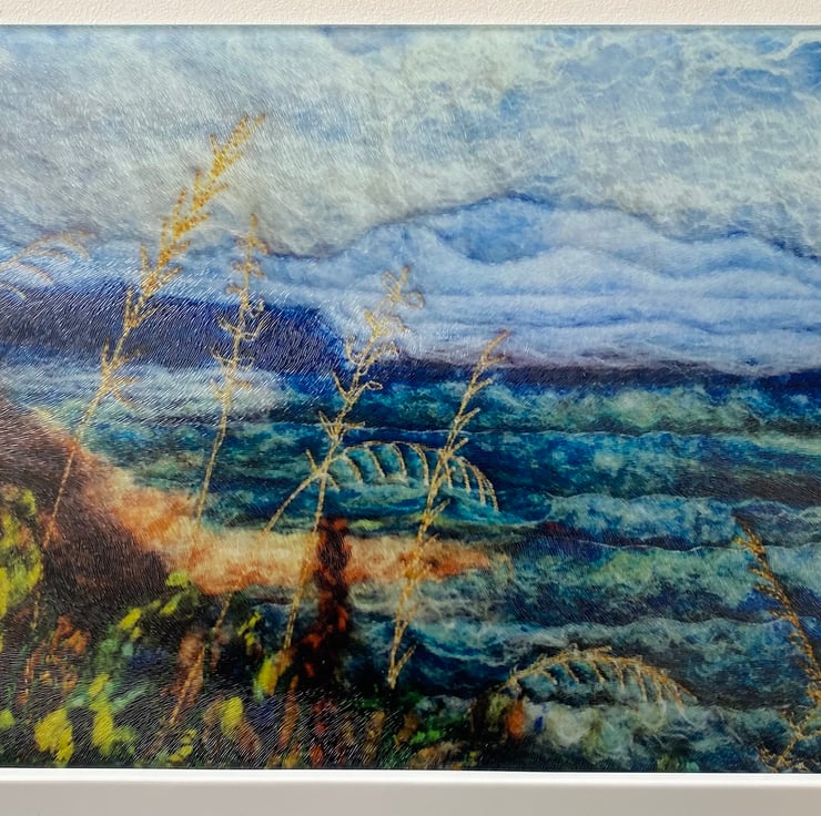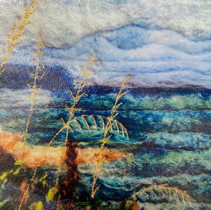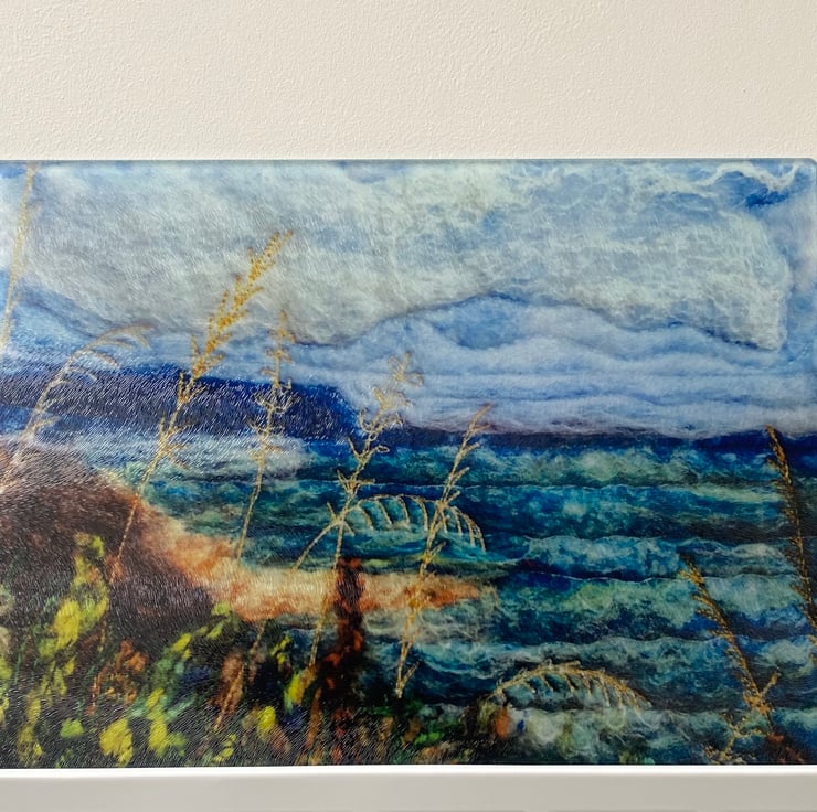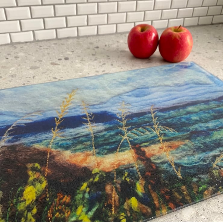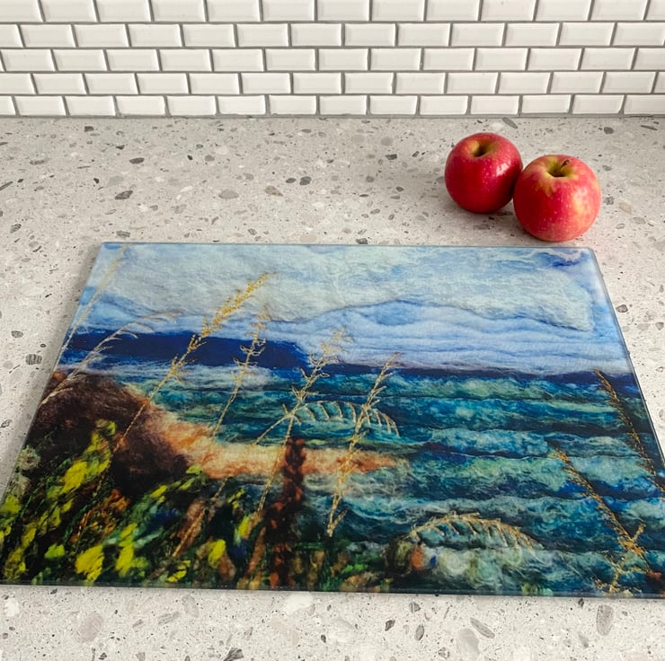 This unique glass chopping board has one of my textile seascapes on it. This one shows Whitby beach with Sandsend beyond. The glass board is heat resistant, makes a perfect cheeseboard, work top saver and a stunning center piece for the table. Easily cleaned. Size A3 landscape.