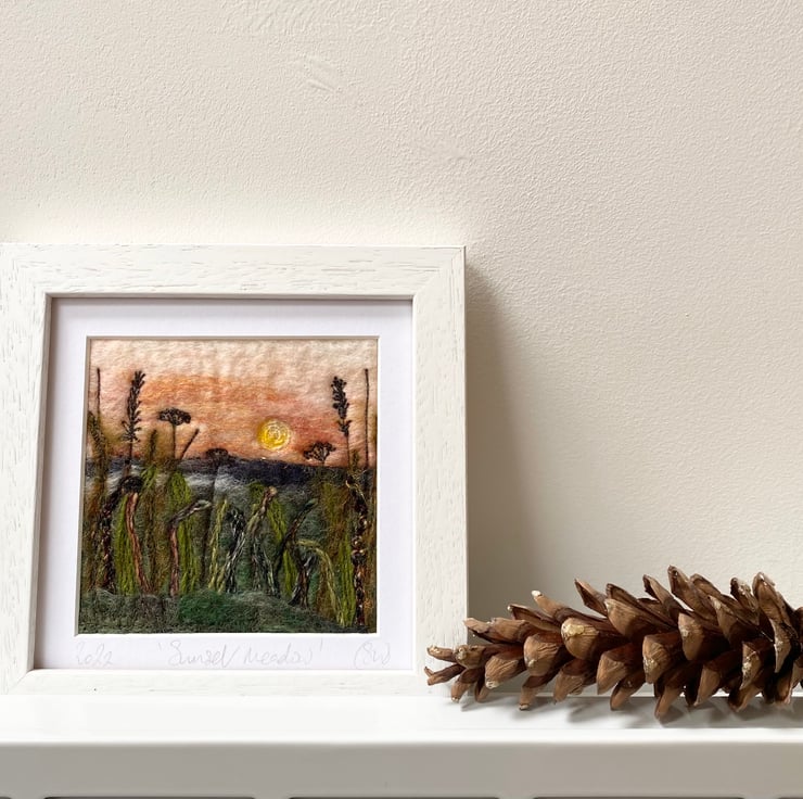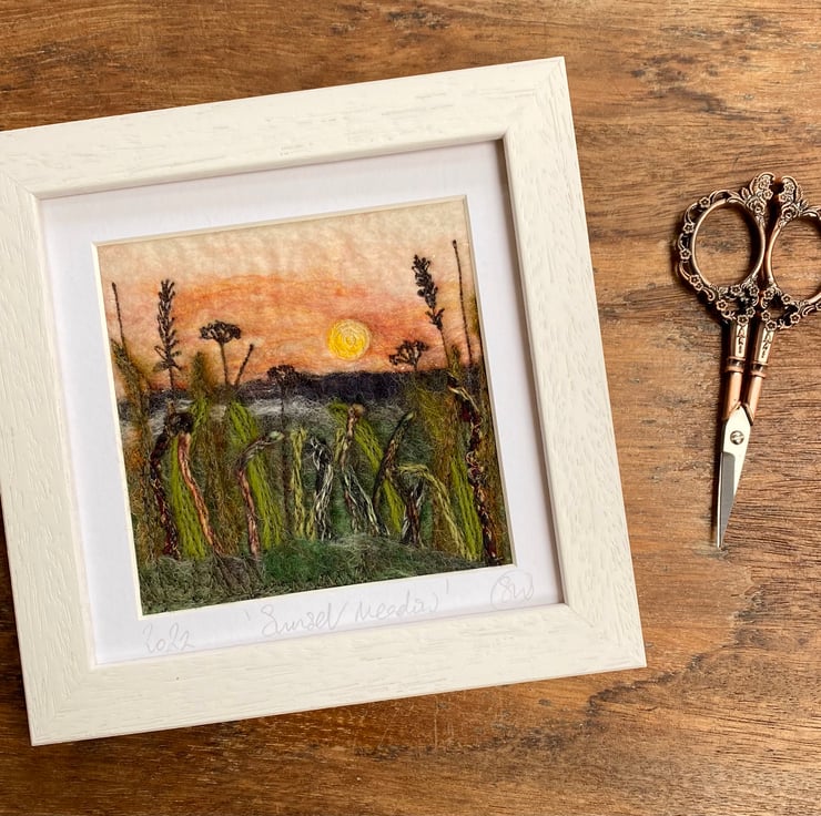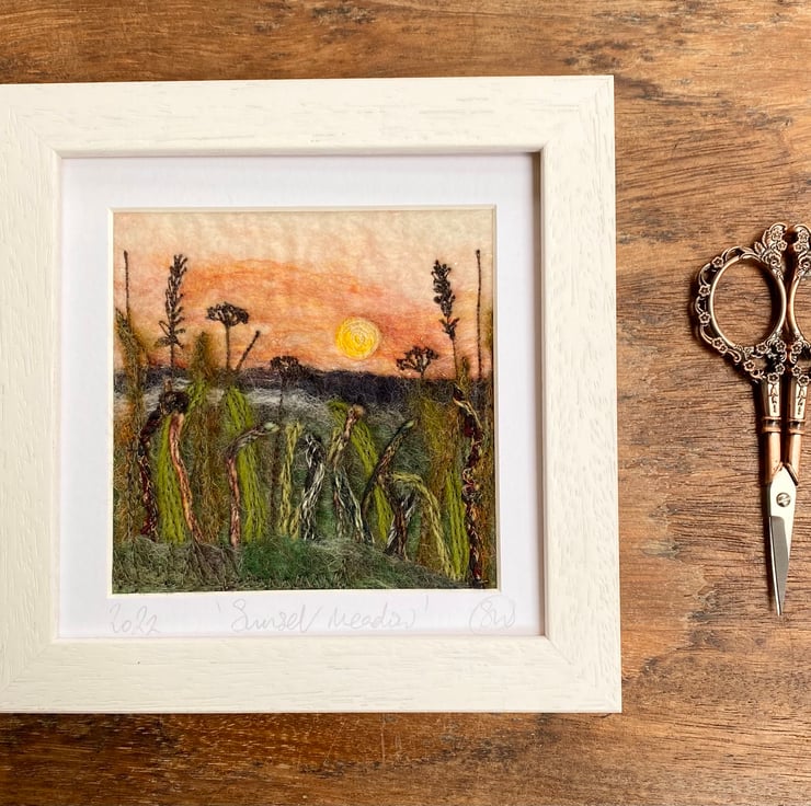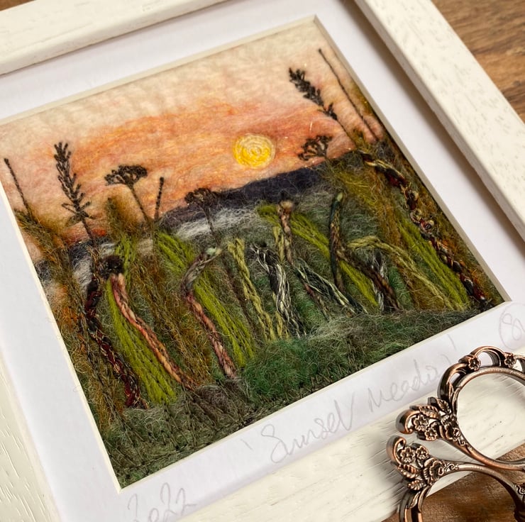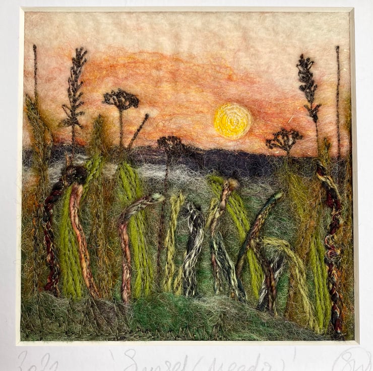 This delightful textured piece is based on my hedgerow series. It shows a sunset scene with grasses and plants in silhouette in the foreground. It’s a wet felting and embellished with free motion embroidery.