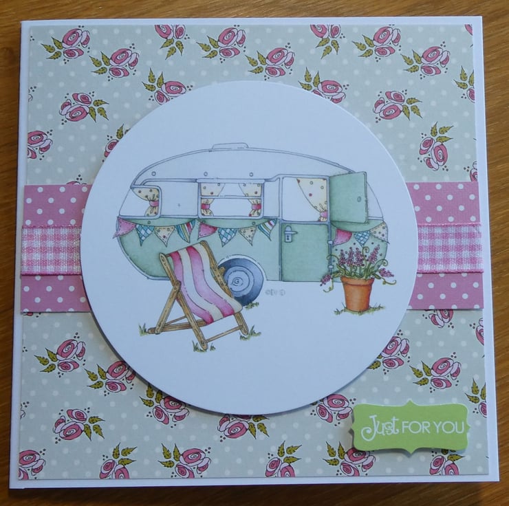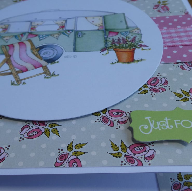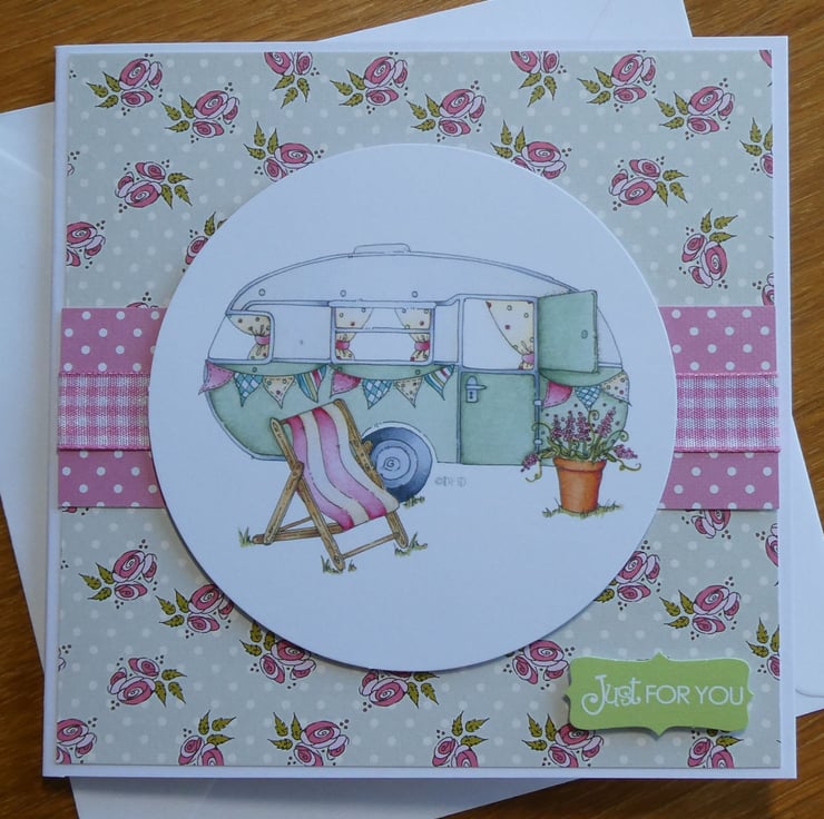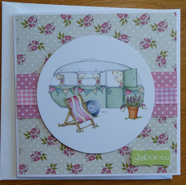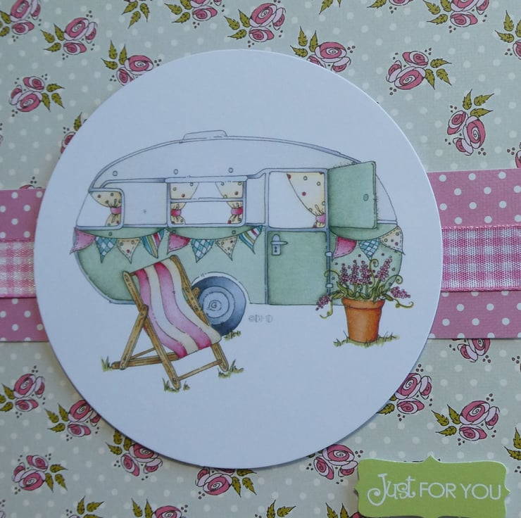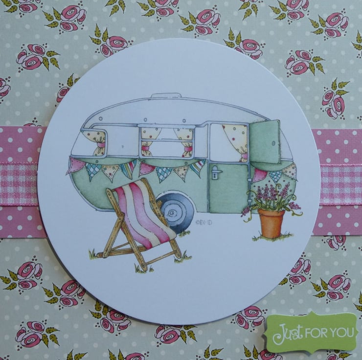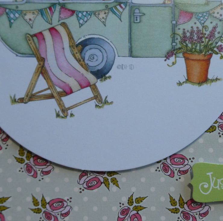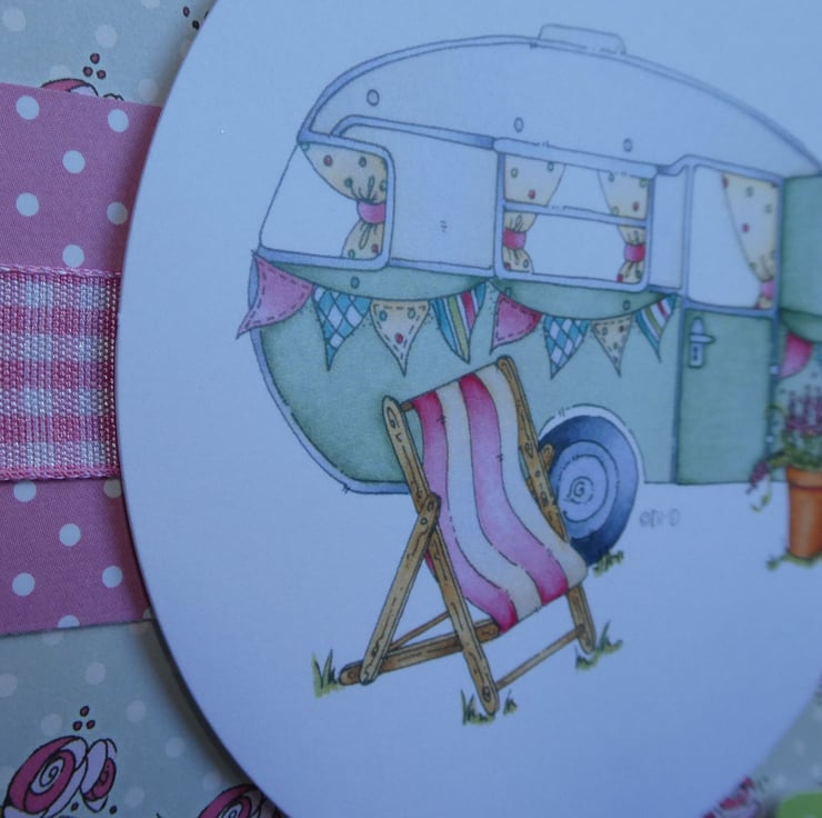 This card has a printed topper showing an old style green and white caravan with pink and green bunting and a pink and cream deck chair.
