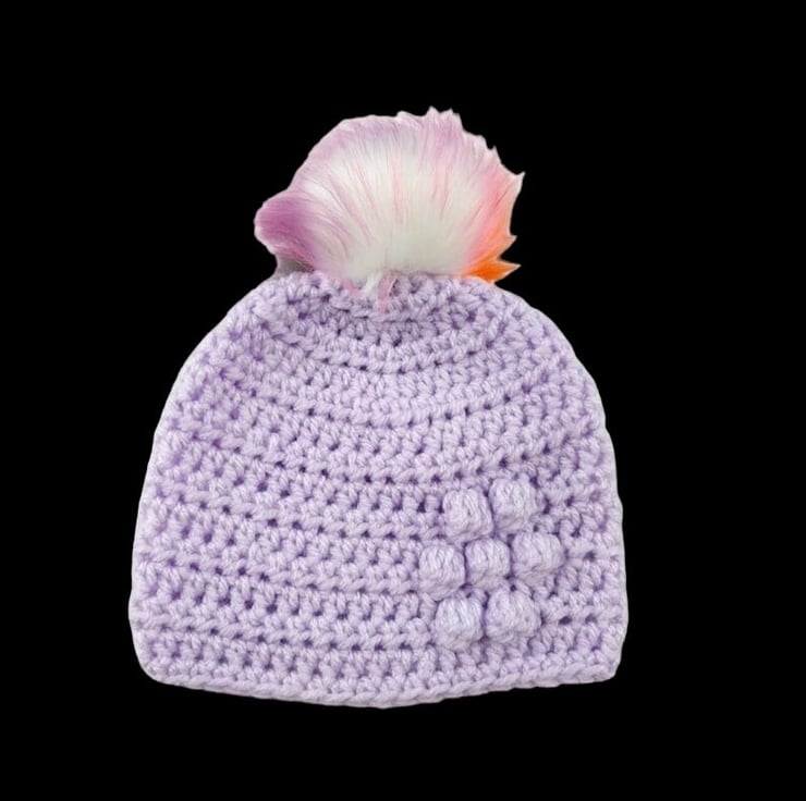 Featuring a delightful bobbly puff flower on the front left side, this hat adds a playful and endearing touch to your baby's attire. What makes this hat truly special is the detachable faux fur pompom, elegantly white with tips in lovely shades of pink, purple, and orange, reminiscent of a blossoming garden. The pompom easily attaches via an elastic loop fastened onto a button inside the hat, offering customization and effortless removal.