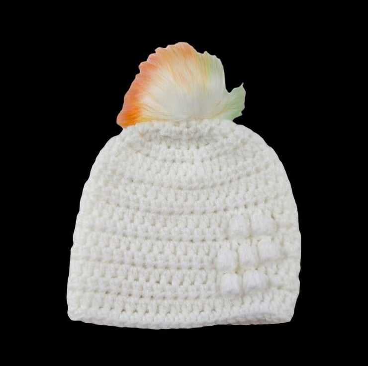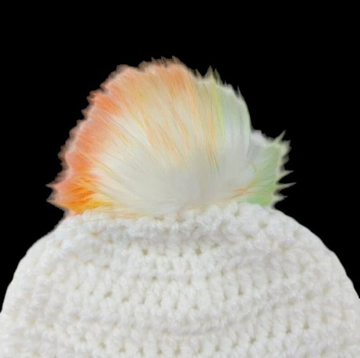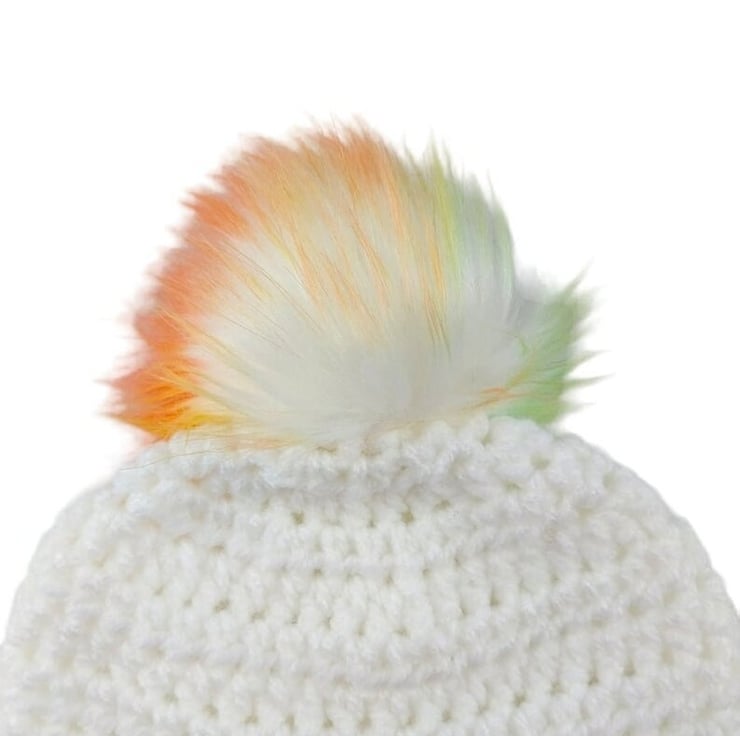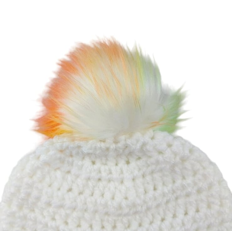 White baby crocheted hat white faux fur pompom with orange yellow & green