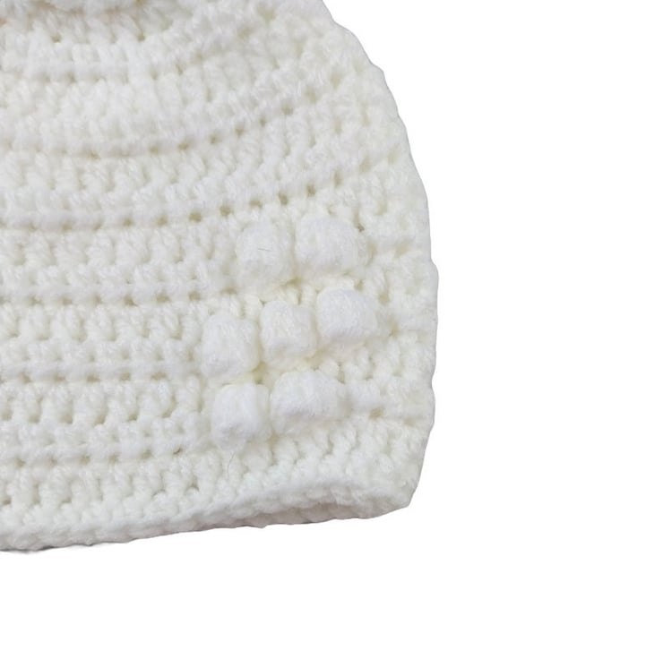 Celebrate the innocence of white and the playful accents with this White Baby Crocheted Hat, a delightful piece that effortlessly marries coziness and charm. Pattern by Kerry Jayne Designs.