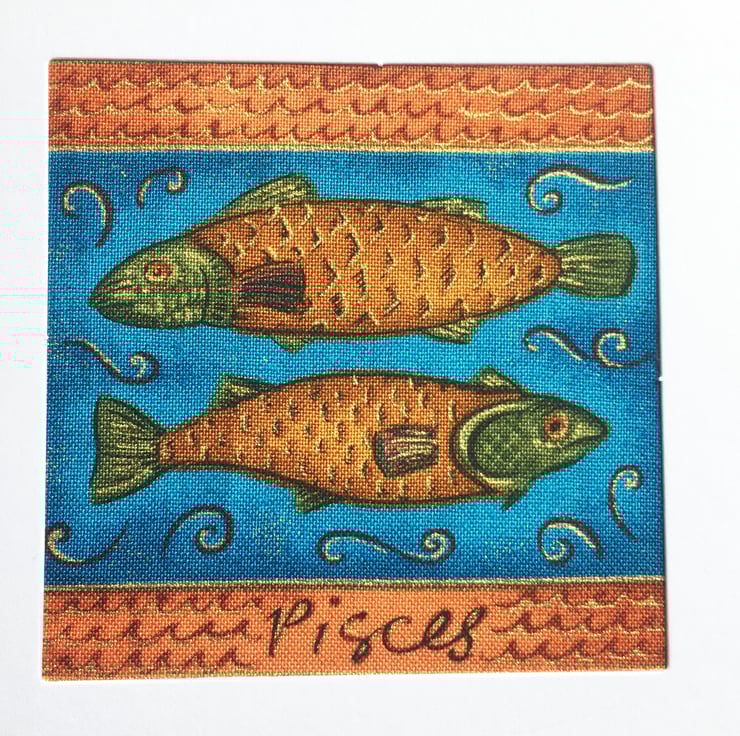 The card has a colourful fabric panel of Pisces in the front aperture and measures 13x18cm. The inside is blank.