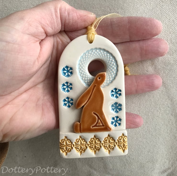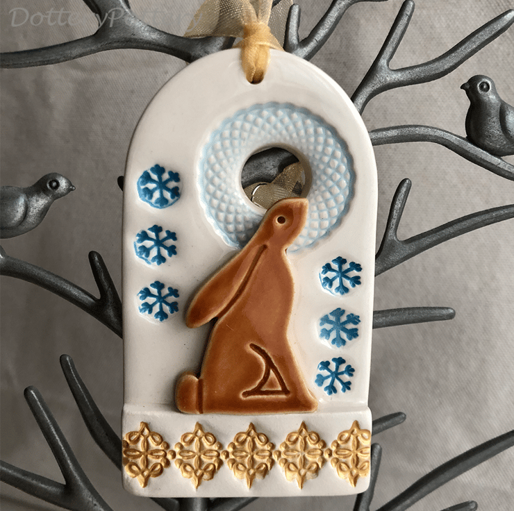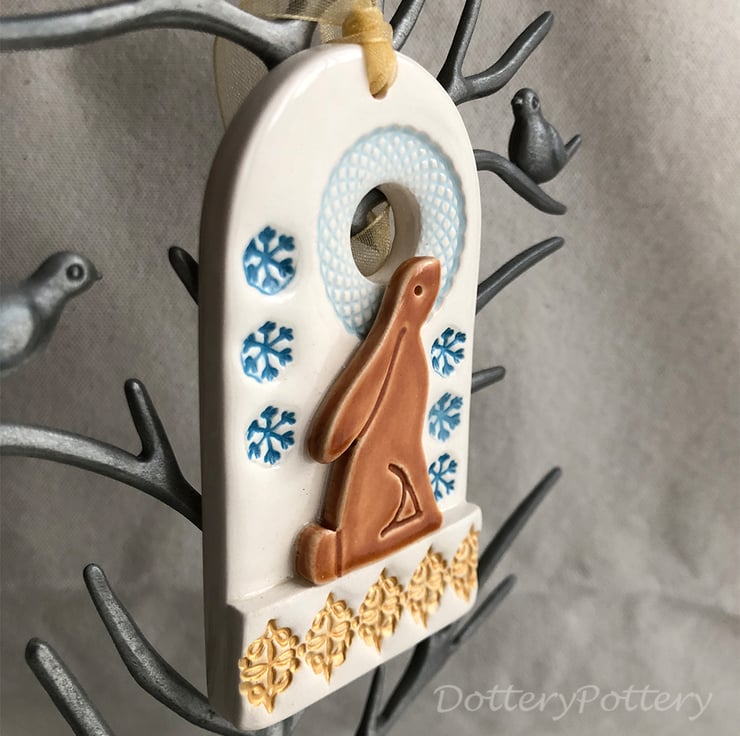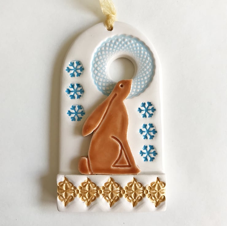 This cute Christmas decoration features a wintery scene with a moongazing hare. It has a gold metallic feature along the bottom. It has been fired twice and finished with rich, glossy glazes. Glazed on the front only. It measures 9cm x 5cm x 1cm deep and hangs from a gold coloured organza ribbon.