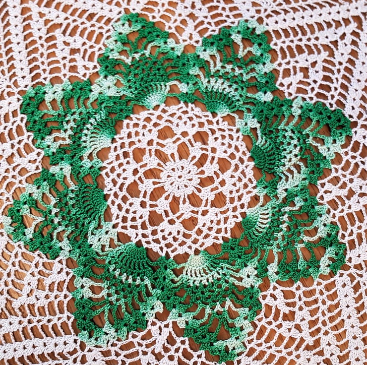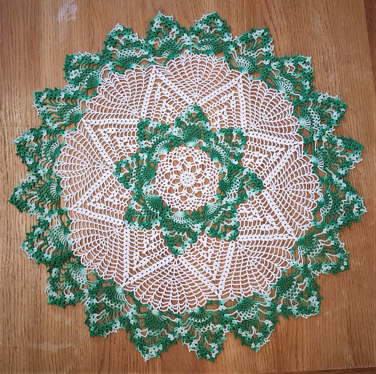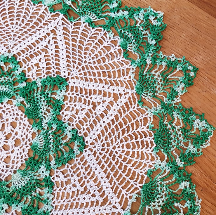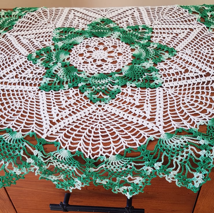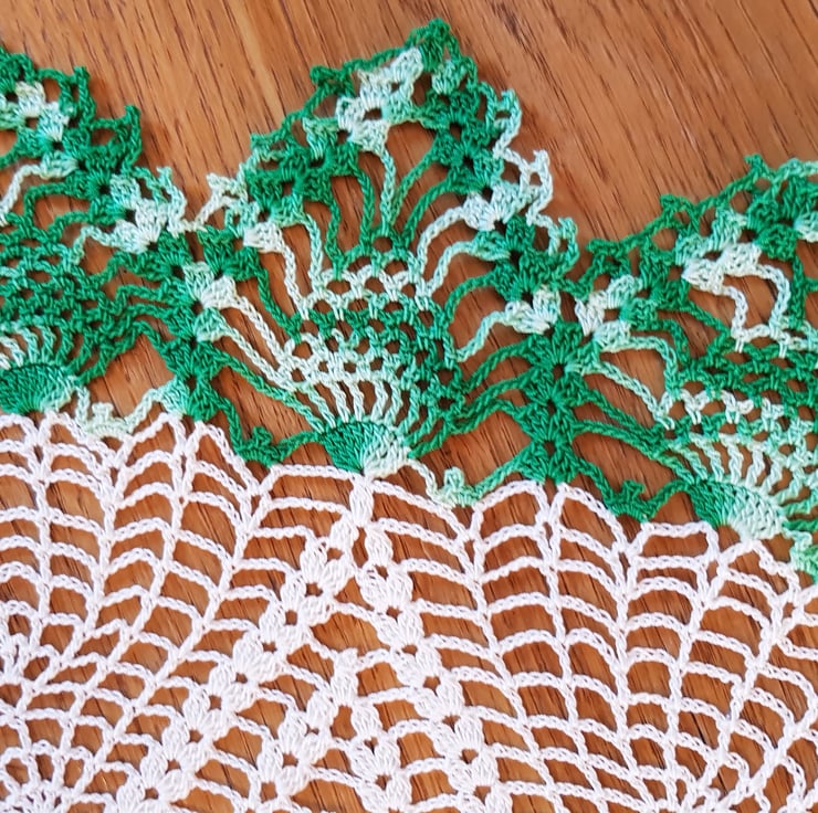 This item is a large table decoration - handcrocheted in a classic cream cotton, with the addition of this striking multicolour green to the centre and outer edge