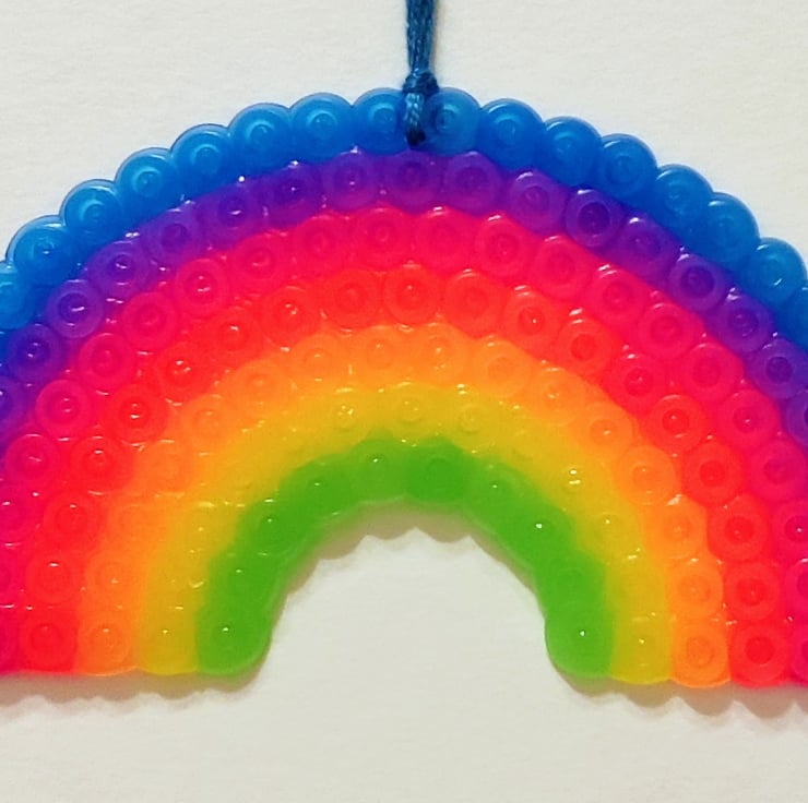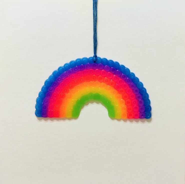 This multicolored rainbow is one from a series of hama bead ornament cards. It is thread with embroidery yarn so that it can be hung as an ornament.