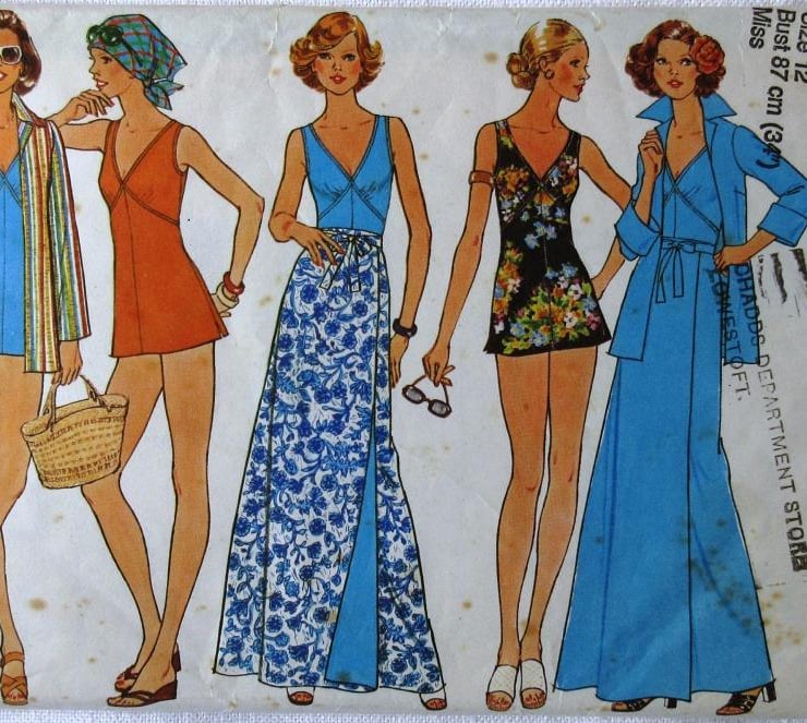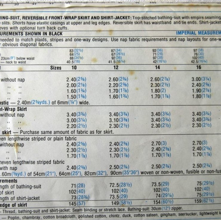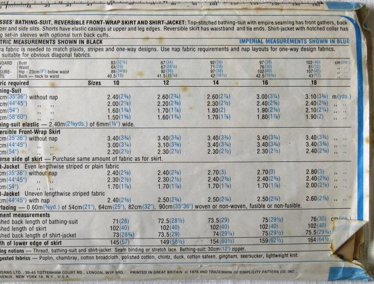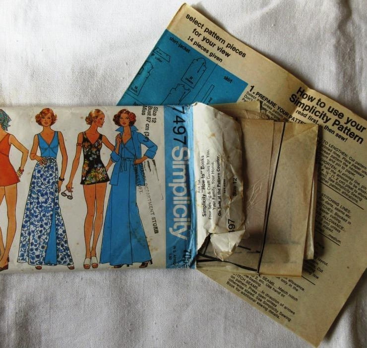 A sewing pattern for a bathing suit, reversible wrap-front skirt and shirt-jacket in size 12 (bust 34"/87 cm, Simplicity 7497). The top-stitched bathing suit with empire seaming has front gathers, back zipper and side slits. The shorts have elastic casings at upper and leg edges. The reversible skirt has waistband and tie ends. The shirt-jacket with notched collar has long set-in sleeves with optional turn-back cuffs. The pattern has been used to make the skirt in a short version (the pattern piece has been cut on the lengthen/shorten line, but the excess paper is still there), The jacket pattern appears to have been used, but the pieces have not been cut on the cutting lines. The bathing suit and shorts patterns have not been used. The envelope is slightly torn. The pattern is dated 1976.