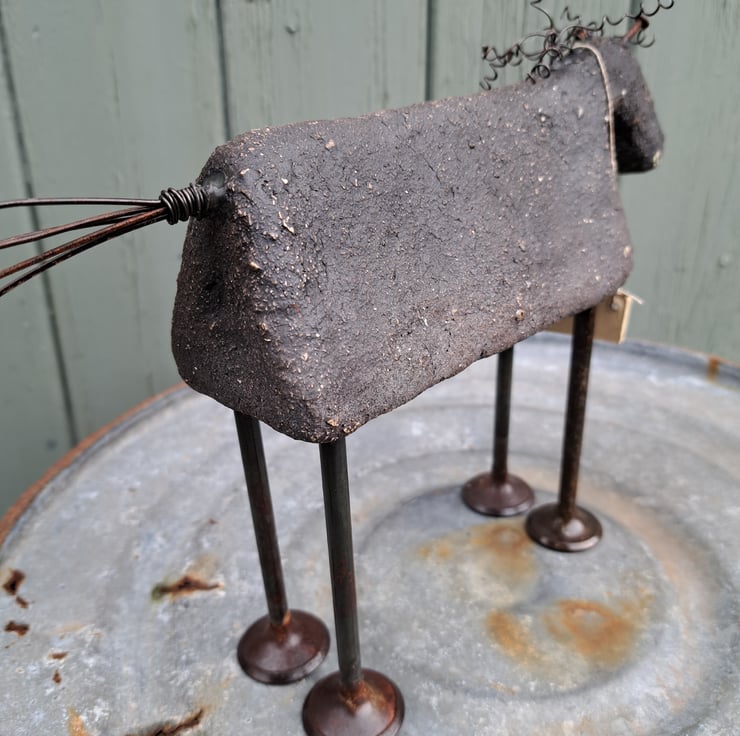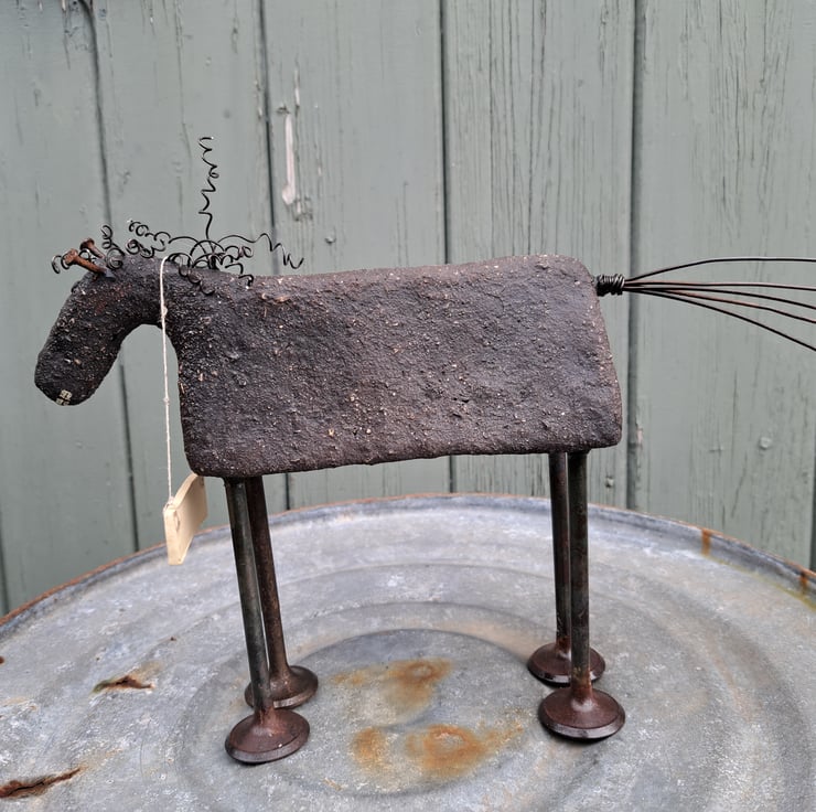 Horse sculpture from the Station Cat Pottery...handmade in a high fired clay, his mane and tail are repurposed wire and his legs are recycled engine valves.