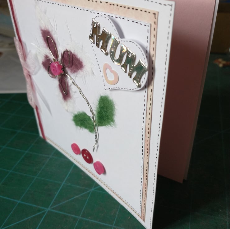A completely handmade and uniquely designed card. Consisting of a flower outlined in silver metal. Filled in for ith mulberry paper petals and leaves. A hear tah with mum due cut from silver mirri card Embellished with buttons and organza ribbon and bow