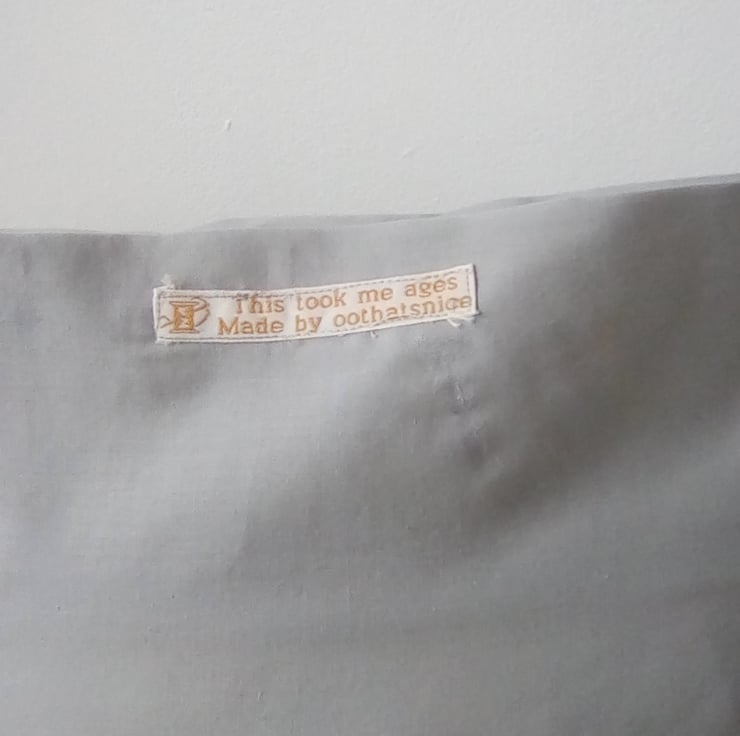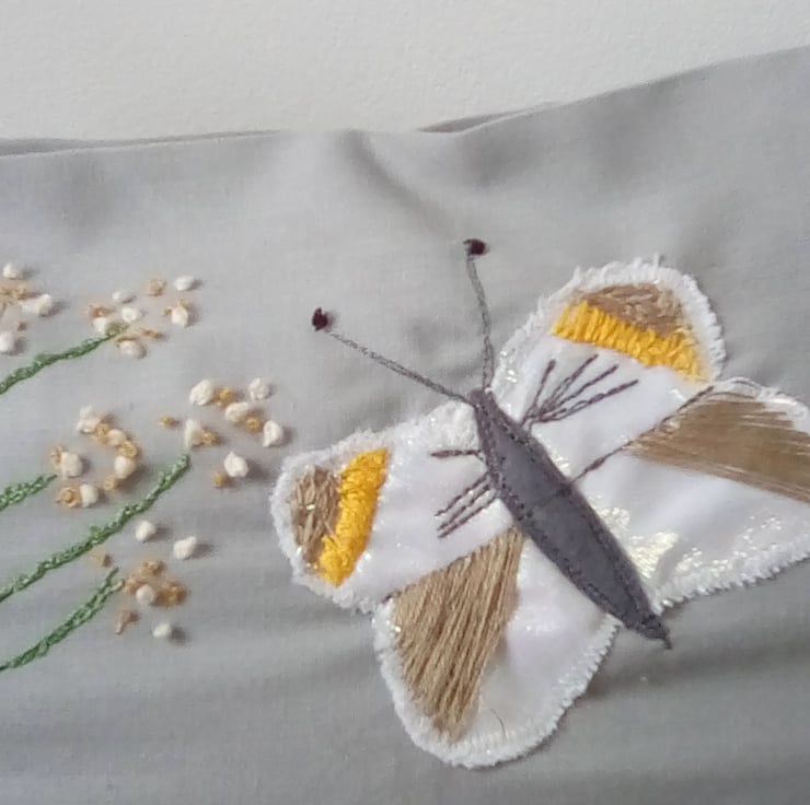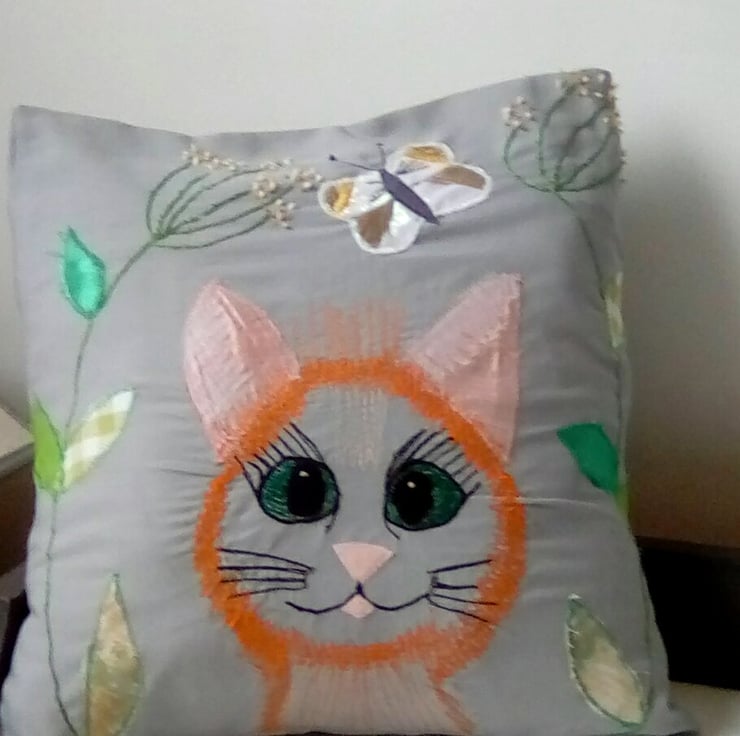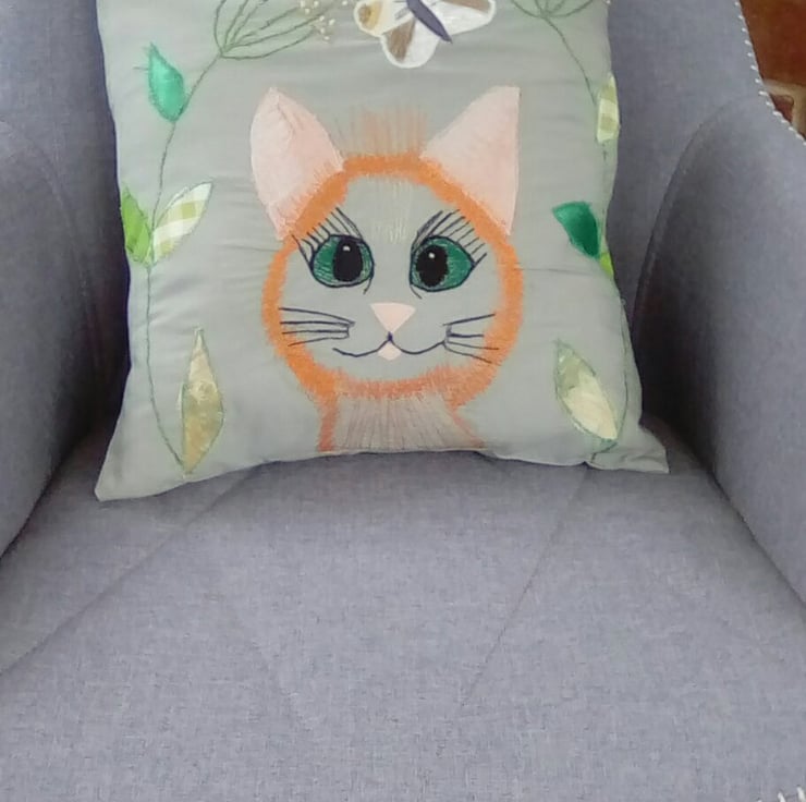 I have made this cat cushion using a plain Grey cotton background. I have then used the free motion embroidery technique to create the cute cat. I have then used applique using silk fabric to create the ears and leaves. The sweet Mallow flowers have been hand embroidered and the butterfly has been made from felt and voile fabric.