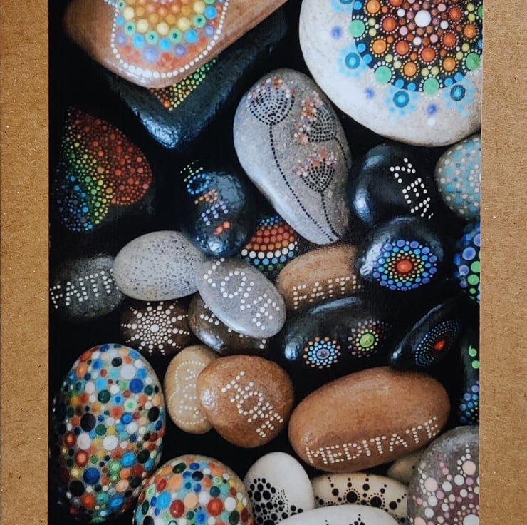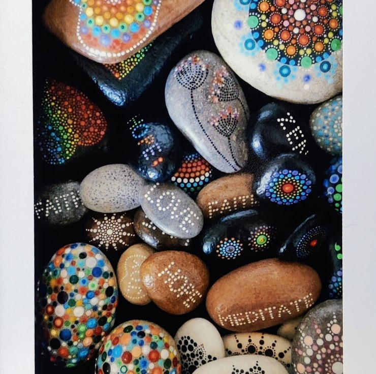 Matt Print of a collection of my Mandala Stones. Mounted on White Card or Kraft Brown Card.