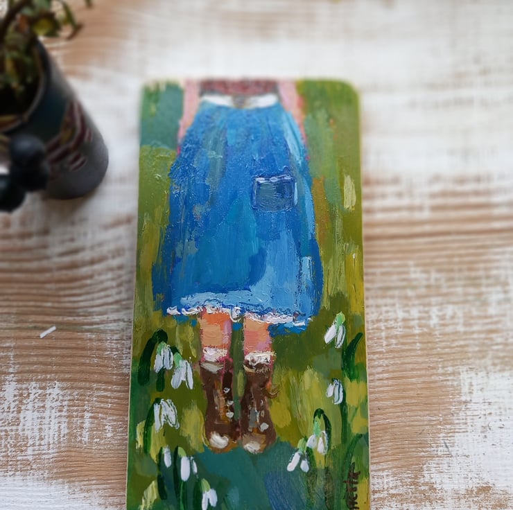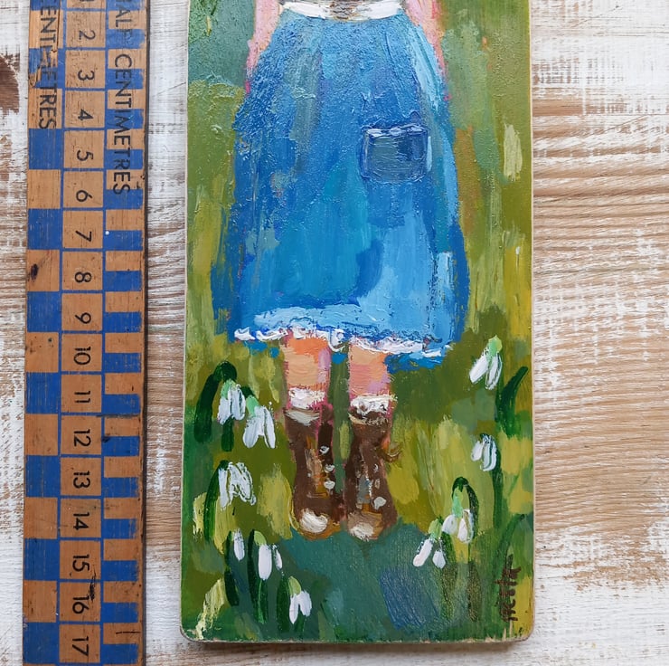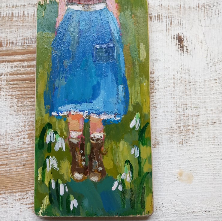 Small, sweet painting on reclaimed wood. In my signature style. Standing in nature she breaths deep and feels joy from the first snowdrops. Signed, lightly varnished and ready to hang.
