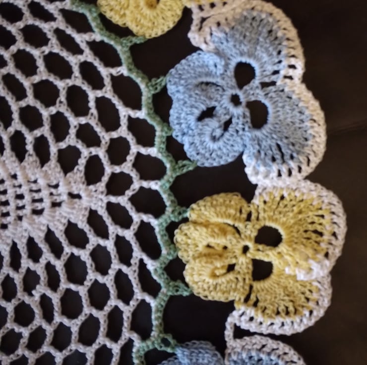 Crochet cotton table mat with a pale blue and yellow pansy border. Hand made in fine cotton. Ideal for a table centre or dressing table. Diameter measures 13 ins (33 cm).