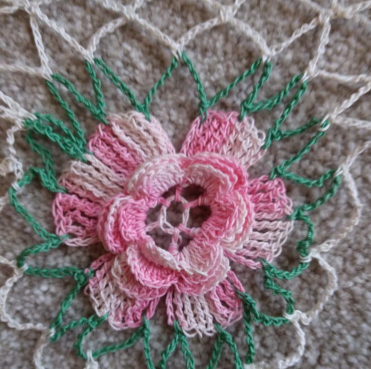 Crochet cotton table mats, in white  with variegated pink roses borders