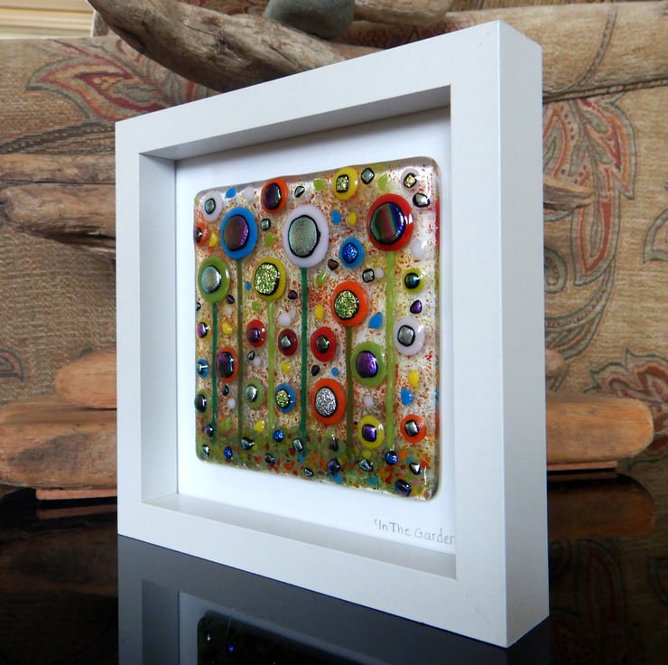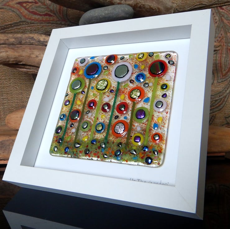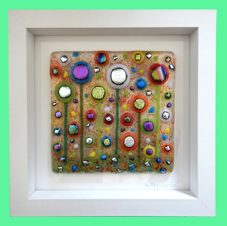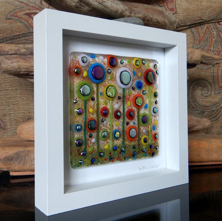 This picture has been made with extreme enthusiasm. It is almost a frenzy of colour and organised chaos. I endeavoured to squeeze in as many flowers as I could without making it too busy. I have used a variety of different glass types and techniques: glass sheet, glass stringers, frit, dichroic glass, millefiori beads, and enamelling.