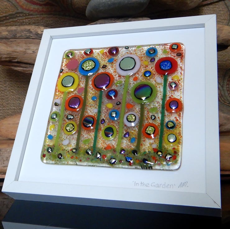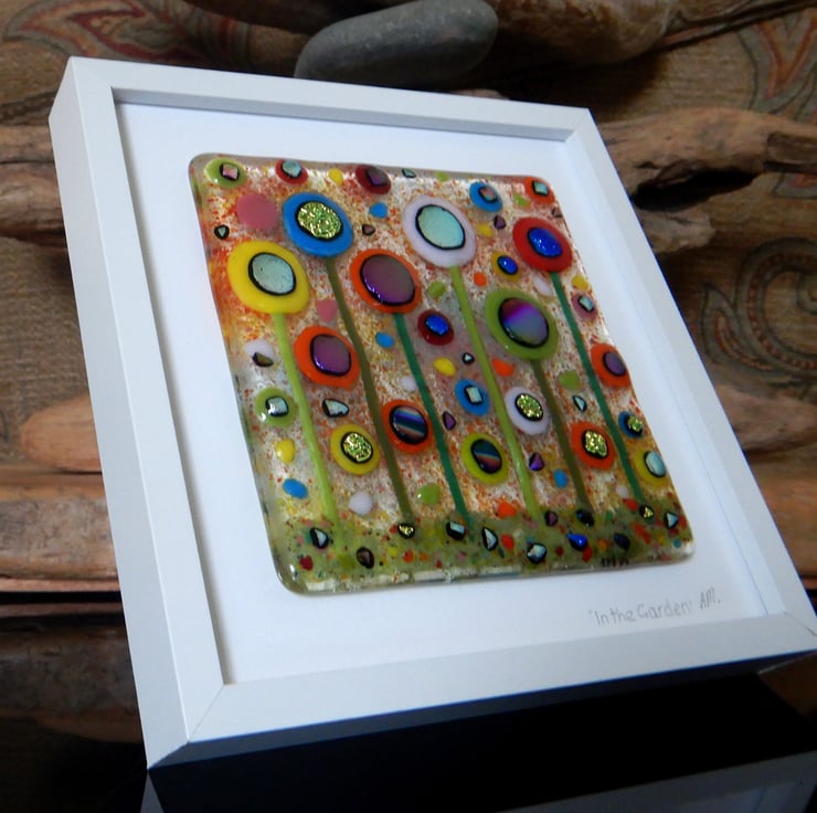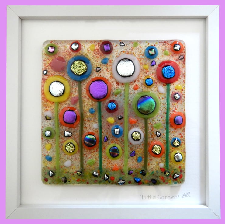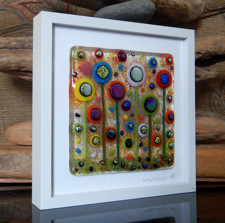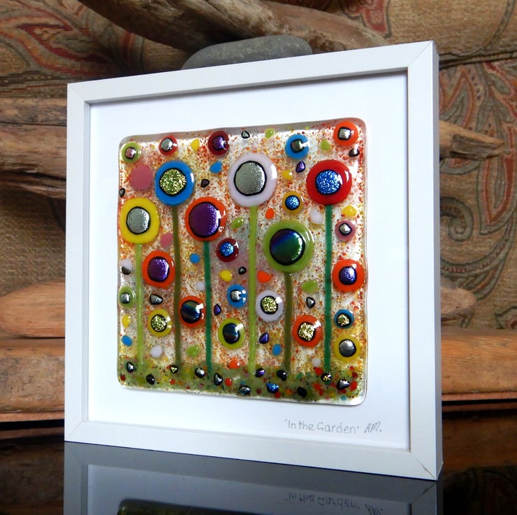 This picture has been made with extreme enthusiasm. It is almost a frenzy of colour and organised chaos. I endeavoured to squeeze in as many flowers as I could without making it too busy. I have used a variety of different glass types and techniques: glass sheet, glass stringers, frit, dichroic glass, millefiori beads, and enamelling.