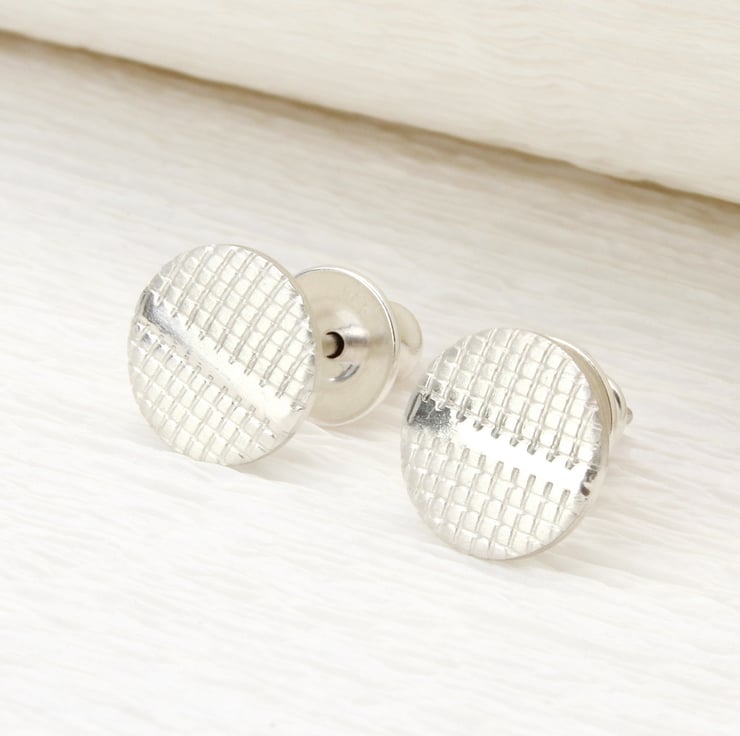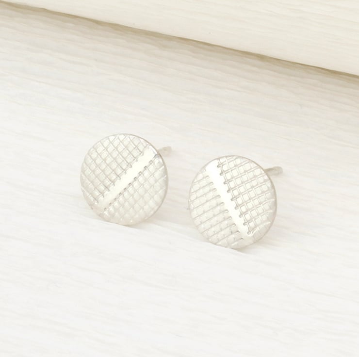 These contemporary small ear studs are handmade from sterling silver and measure 8mm in diameter. A texture has been embossed into the silver which has a matt silver finish and a contrasting polished silver line runs across the centre. These ear studs are flat in shape and have sterling silver posts and ear backs.