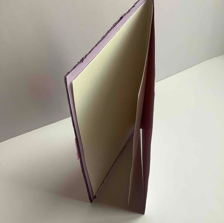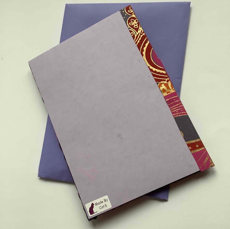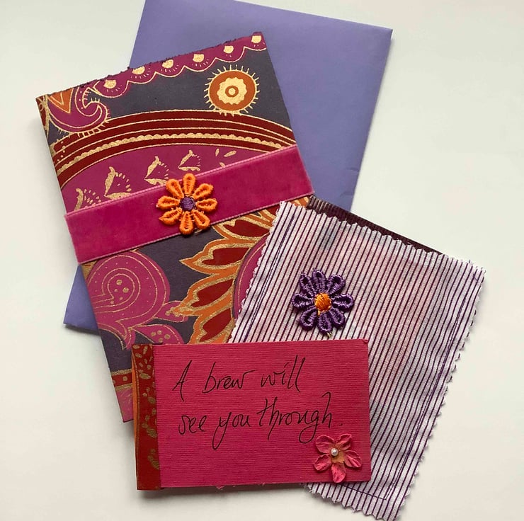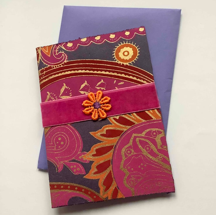 The hand torn paper on the front has vibrant colours of mauve, orange,red, pink and gold. A pink B-road velvet ribbon lies across the centre with an orange and purple flower on top.