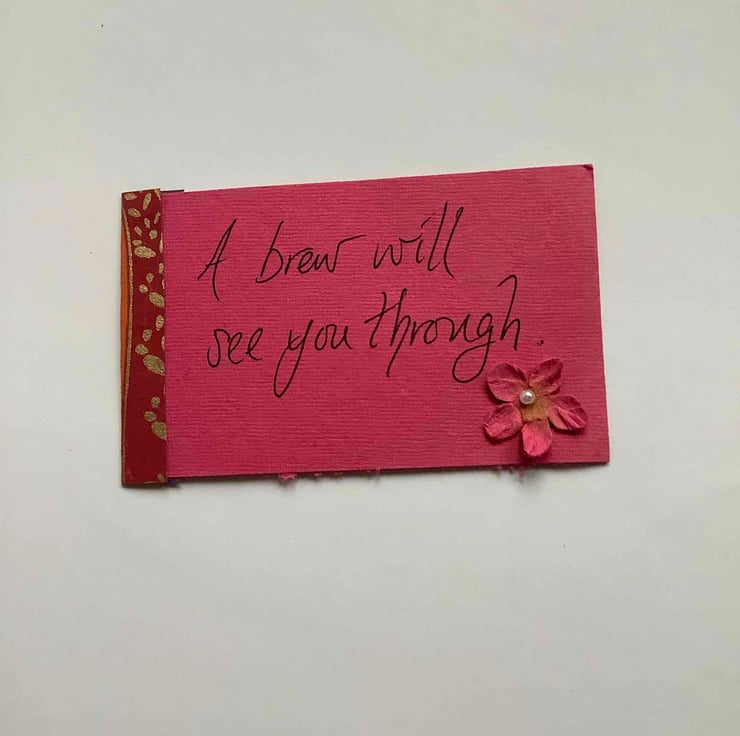 It consists of a card, gift tag, individual wrapped teabag and a handmade cotton pouch