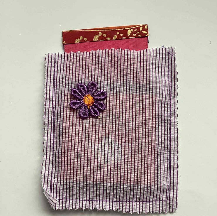 The cotton pouch is white with fine purple vertical lines.attached is a purple flower with an orange centre (teabag inside)