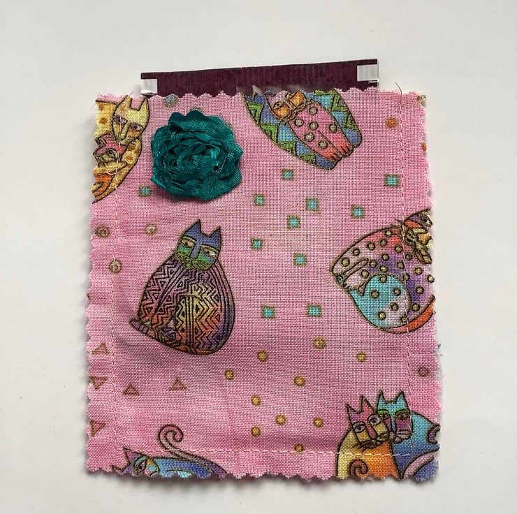 The cotton pouch is pink with colourful cats and a teal material flower attached.(teabag inside)