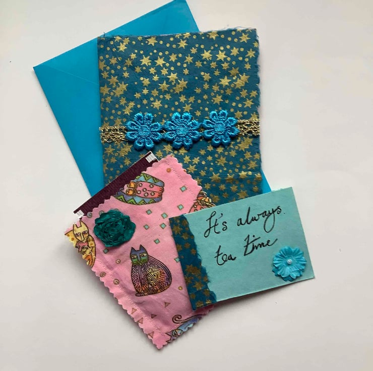 It consists of a card, gift tag, individual wrapped teabag and a handmade cotton pouch