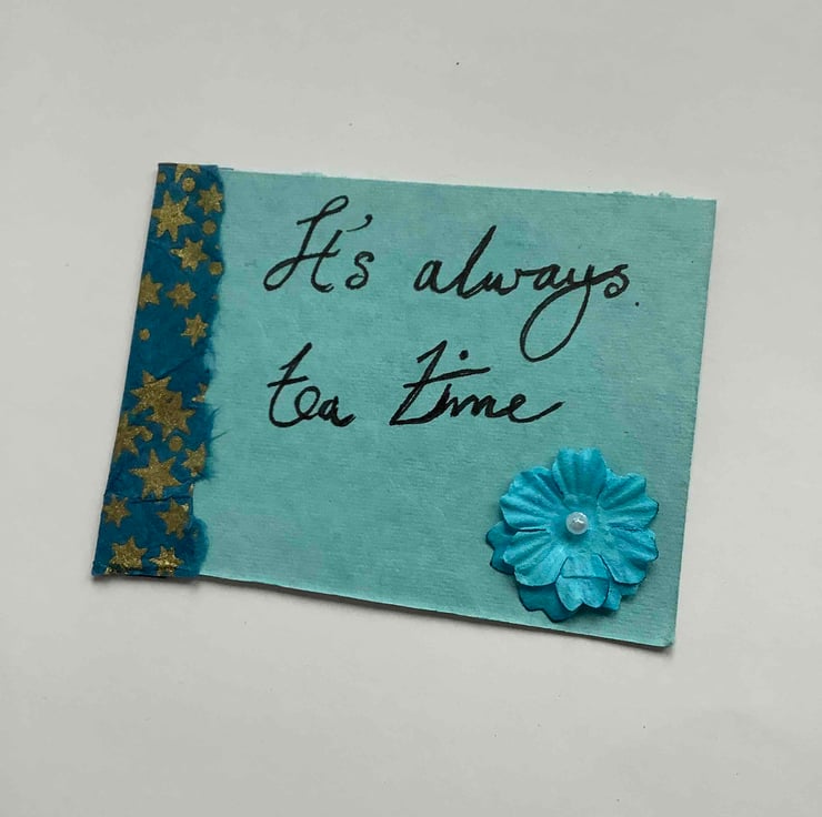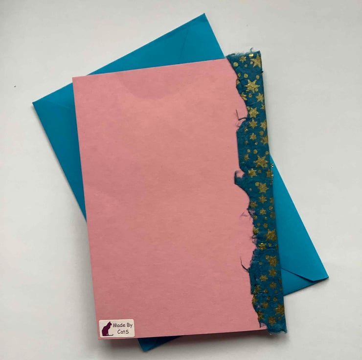 The hand torn paper on the front is blue with lots of golden stars and dots of various sizes. A gold braid stretches across the middle with 3 pretty blue flowers on the top
