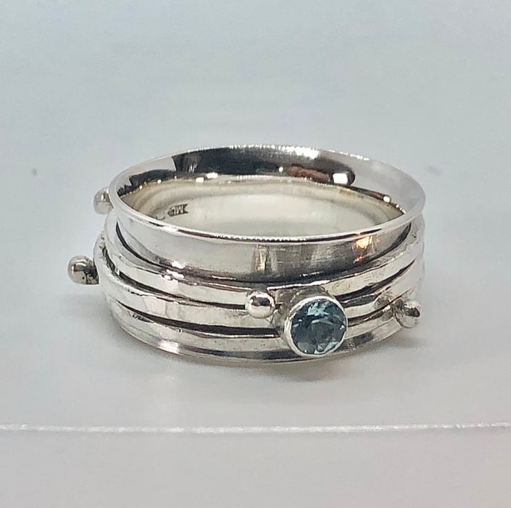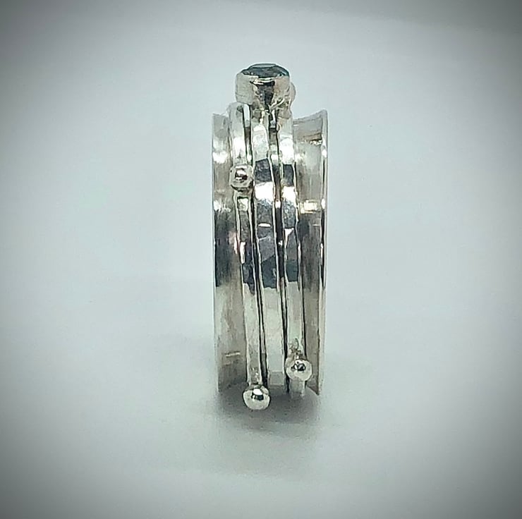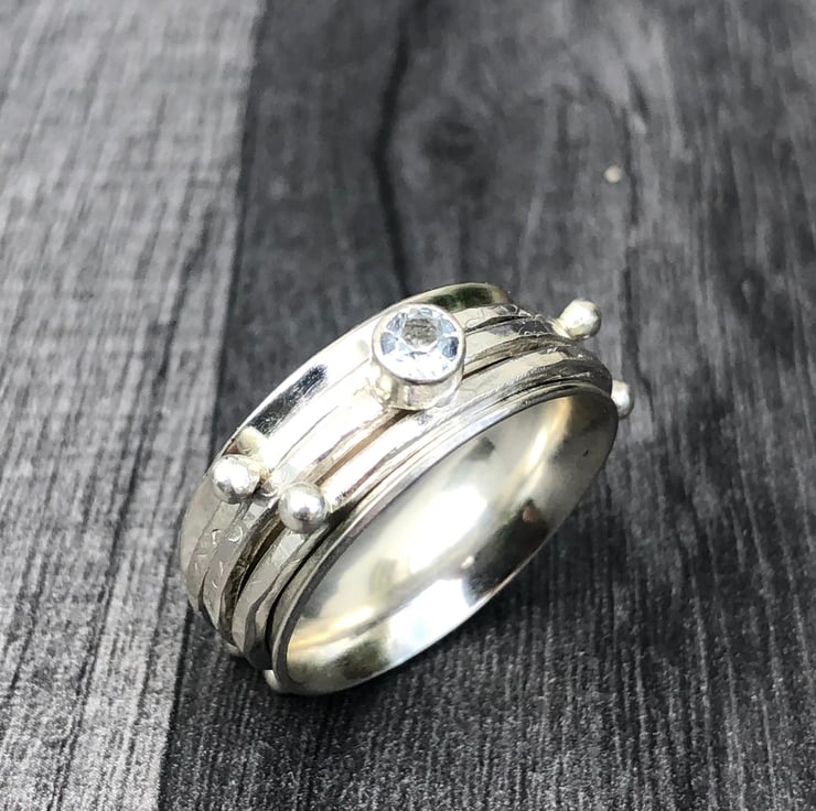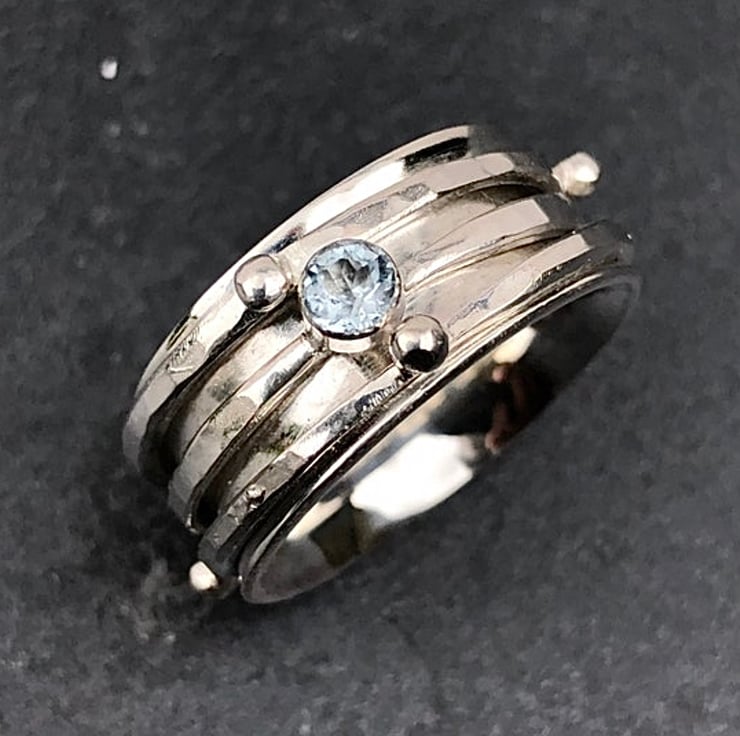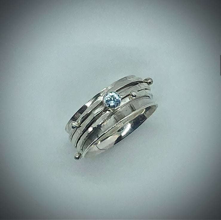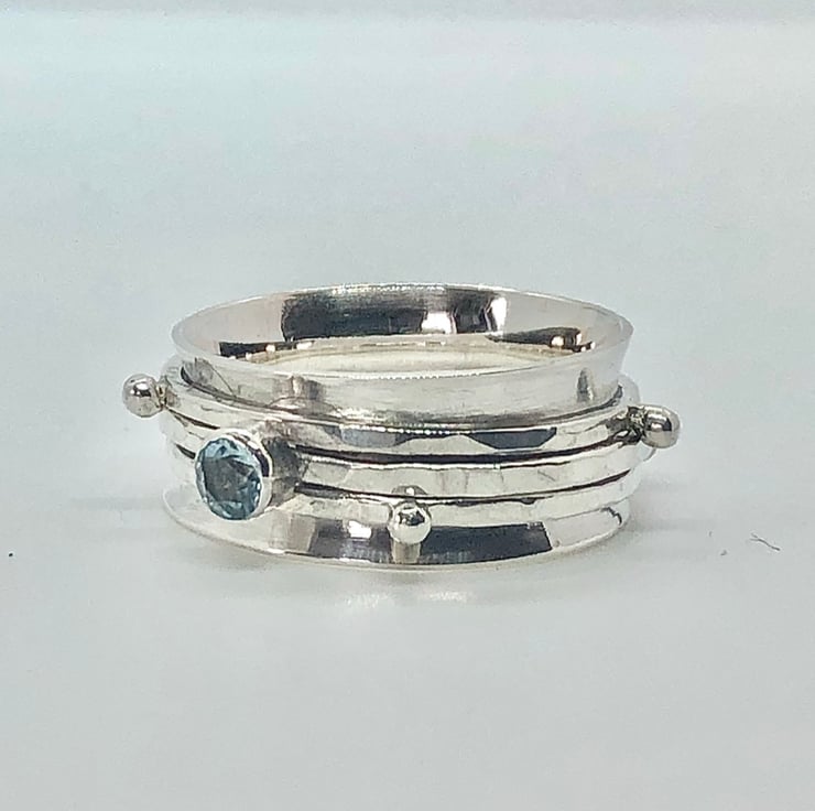 This Aquamarine Spinner Ring is made from Sterling Silver. The Spinner Ring has three rotating hammered rings. The two outside rings have spaced silver balls detail, the inside has a 4mm wide Aquamarine faceted stone. Other stones also available so please do message me. The band width is approx: 9mm wide.
