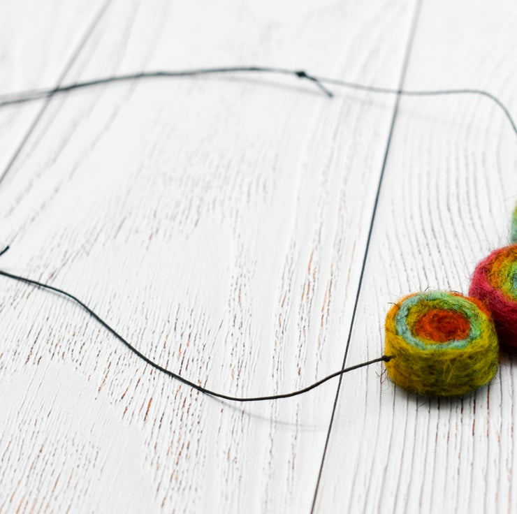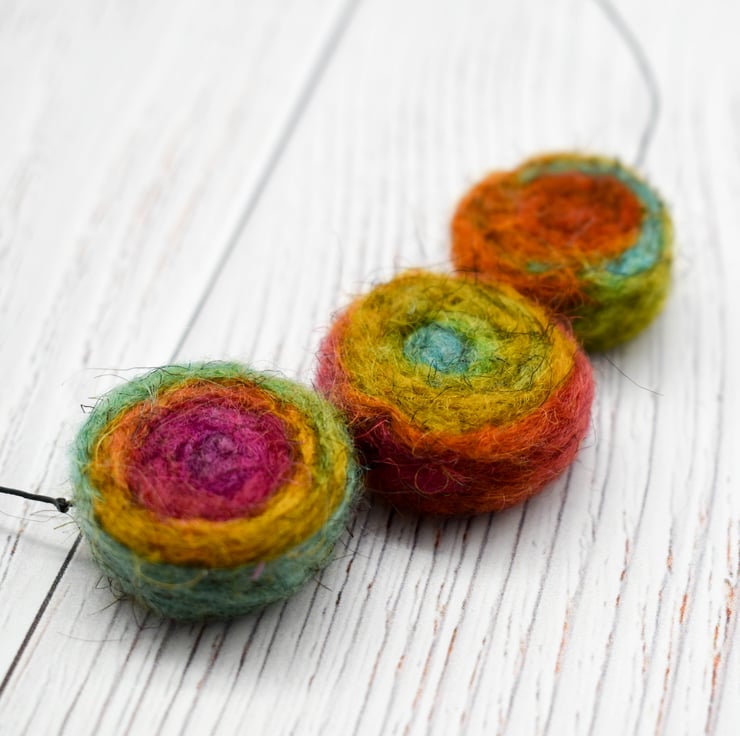 This statement necklace has been created using three felted beads made from shades of pink, yellow, green and blue wool and strung on black 0.5mm hemp cord.
