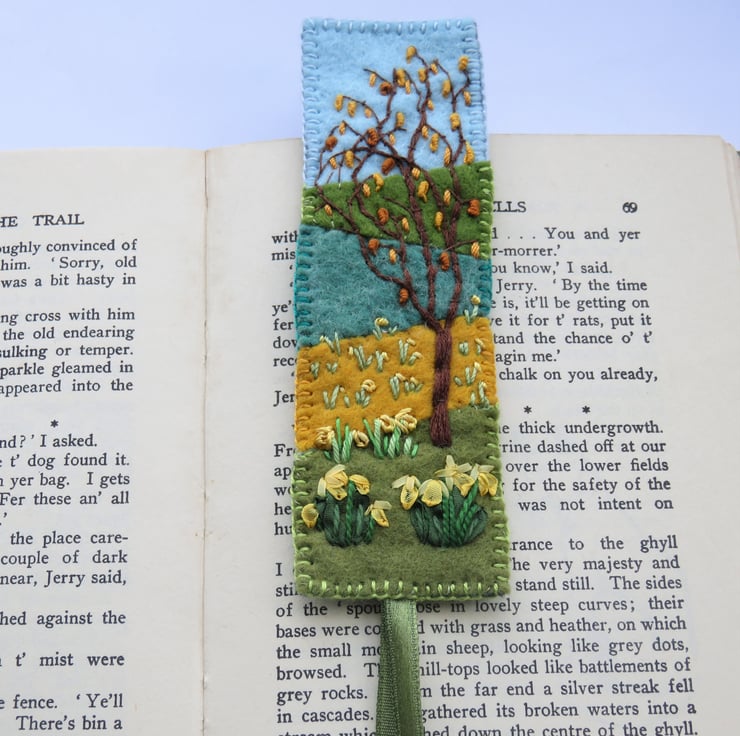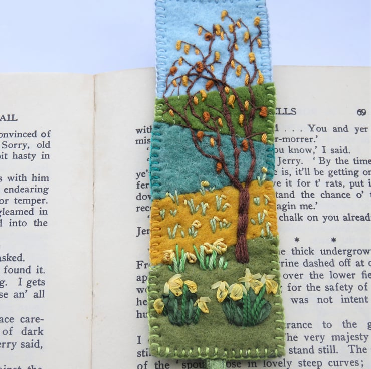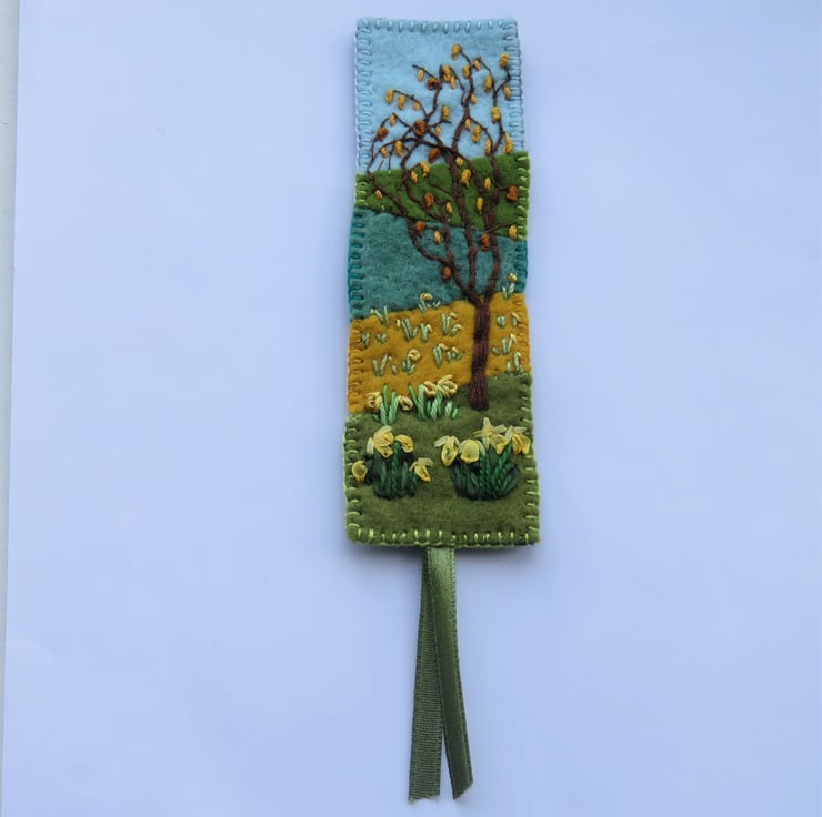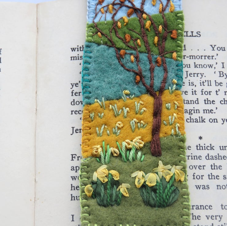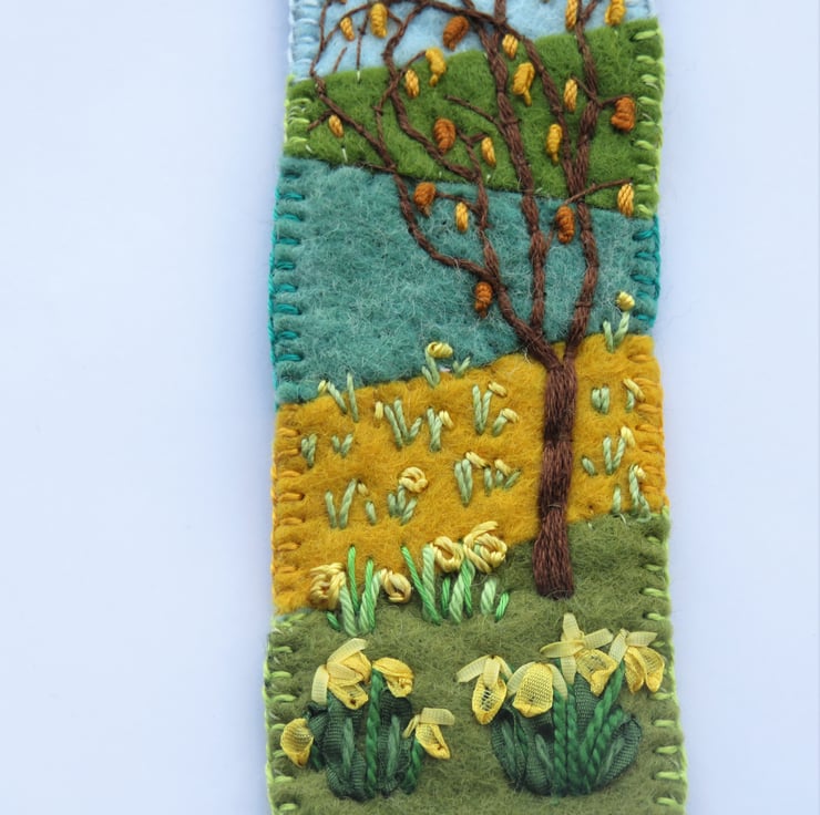 I love stitching little landscape scenes. This one on felt - some of the felt scraps are commercial offcuts. This design features daffodils, those in the foreground stitched in silk ribbon. A tree with catkins adds further interest.