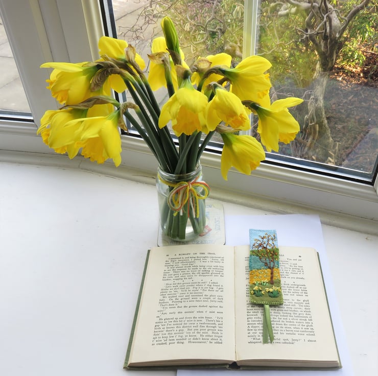 Daffodils, heralds of spring, Easter, longer days... have been handstitched, in a combination of vintage threads and silk ribbons, onto this pretty bookmark. An easy-to-post gift for a book-loving friend.