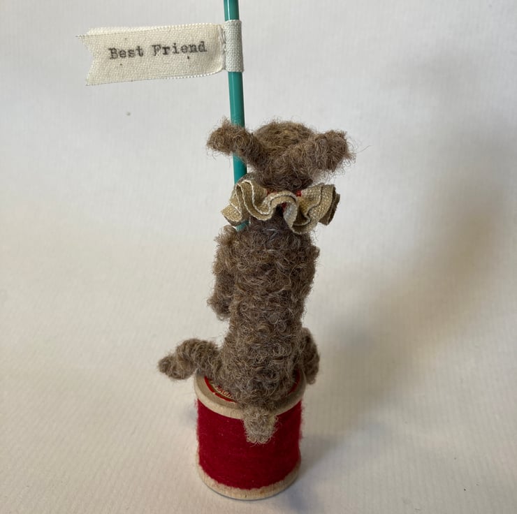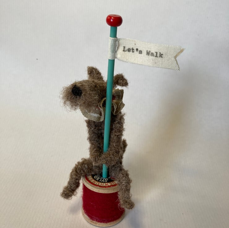 OOAK sculptured miniature dog on a vintage wooden cotton reel. Herbert measures 14cm including his flag by 6cm. He holds a message flag which reads “Let’s walk” on one side and “Best Friend” on the other. The flag pole is made from a vintage knitting needle. All my animals are hand finished with eyes and noses and, if needed, wool whiskers! The wheels are for decorative purposes only and do not turn.