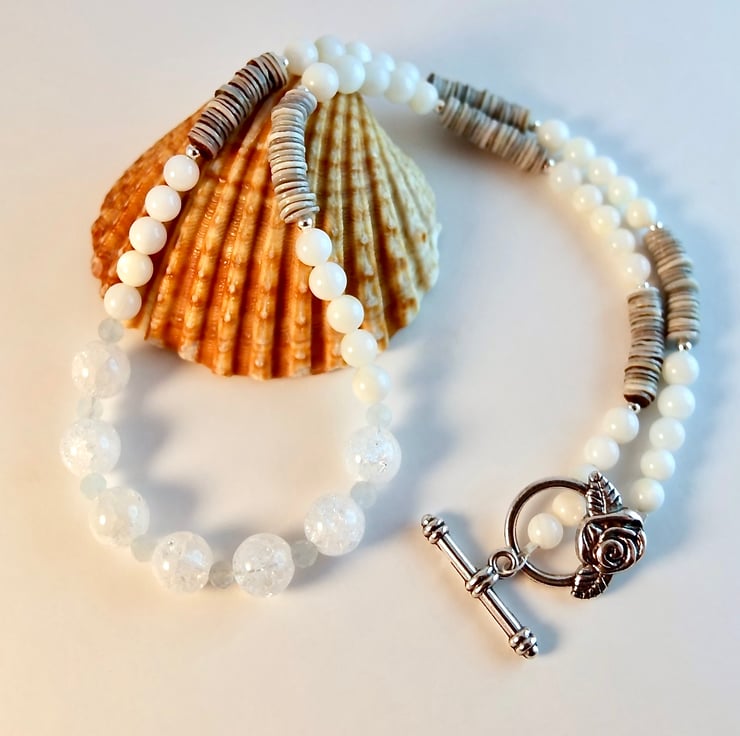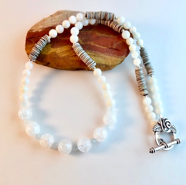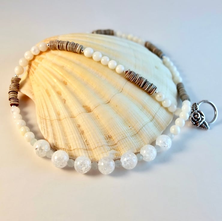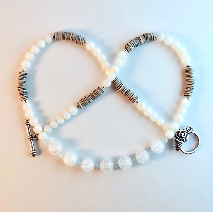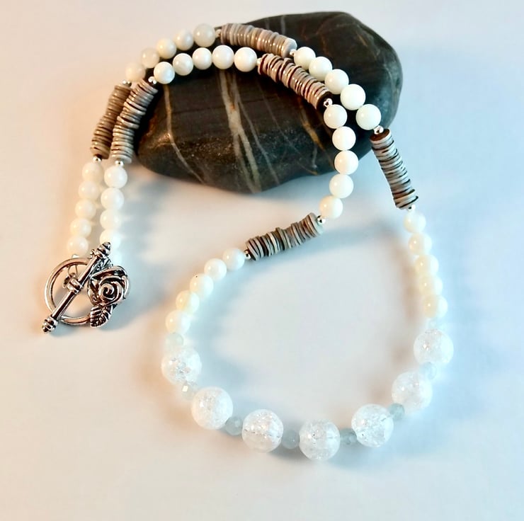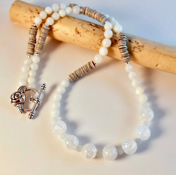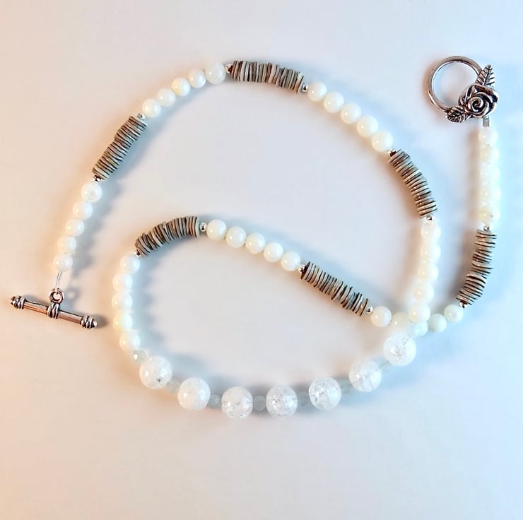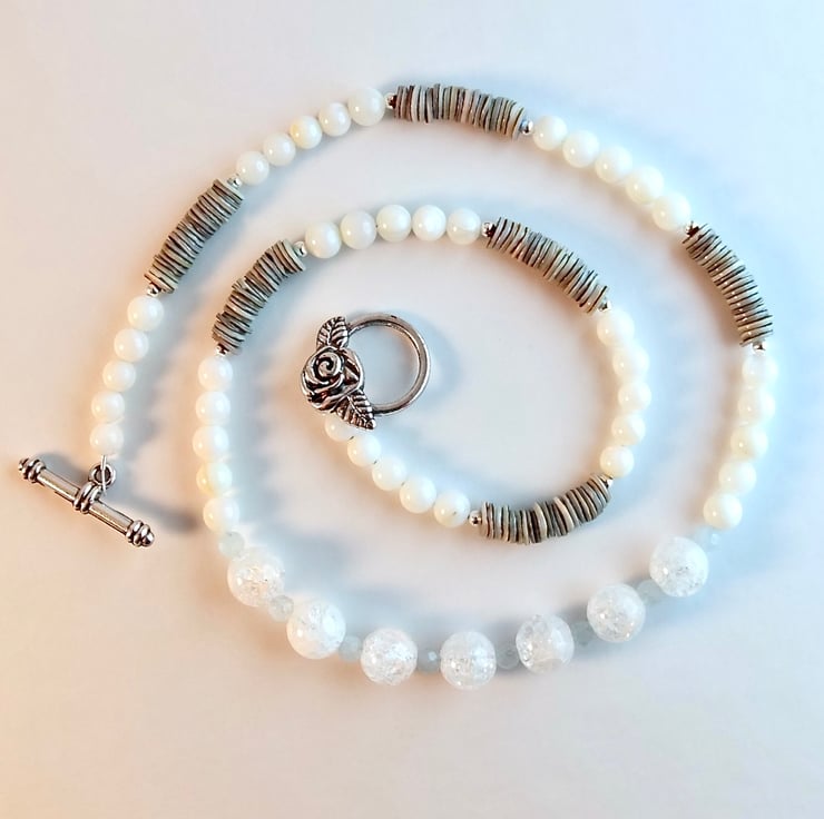 This necklace has subtle hues of silver, white, light greys and palest blue.