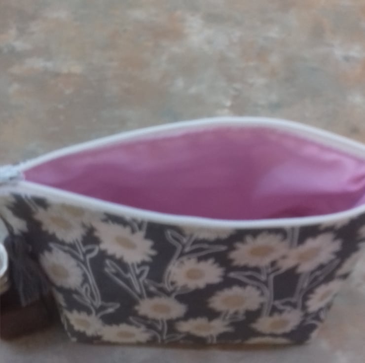 Lined in a pink cotton fabric .A grey hand made tassel is attached to the zip.