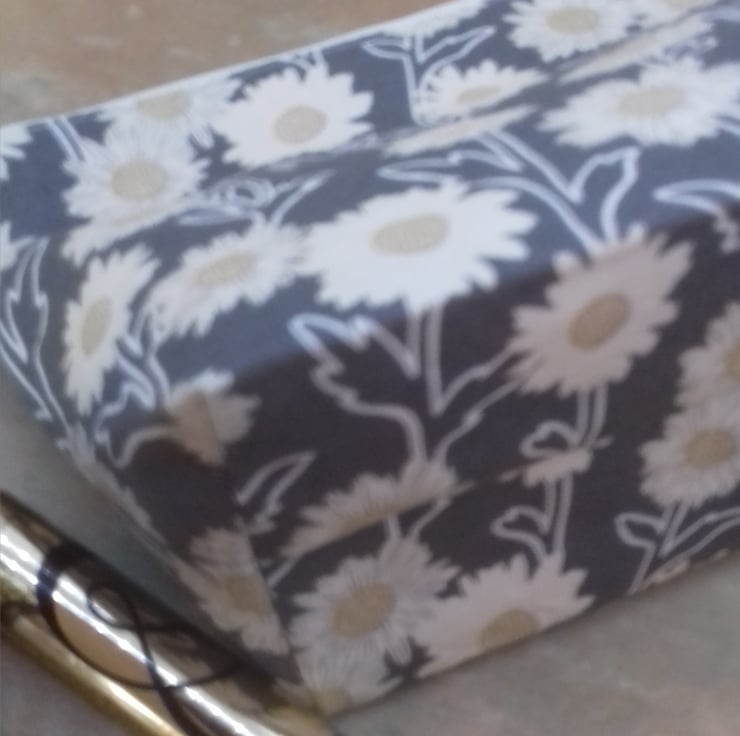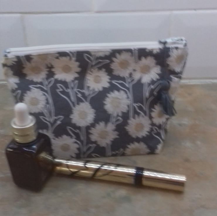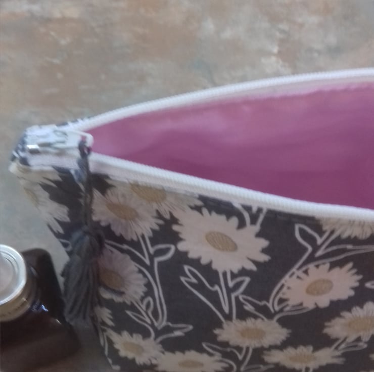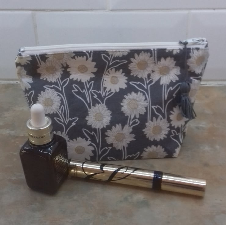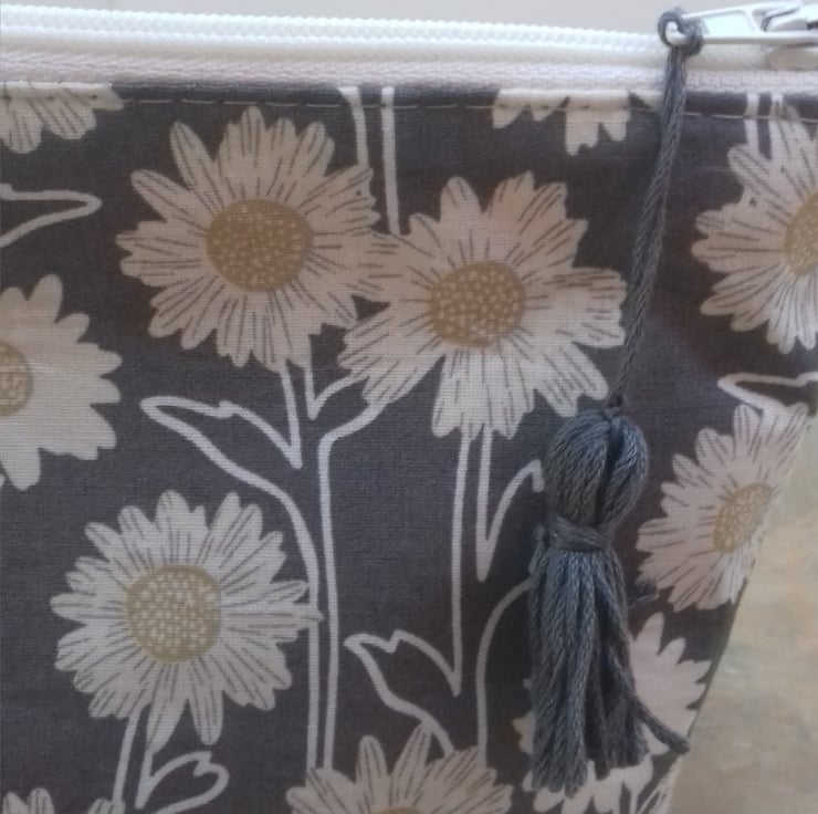 This bag is made from grey cotton fabric with a daisy flower print.