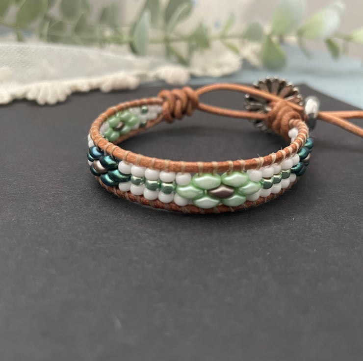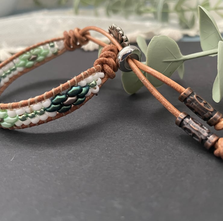 To create this design I have lovingly woven a selection of Czech Super duo, and seed glass beads onto 1.5 mm Italian leather cord. Czech beads are considered to be of the highest quality for durability and depth of colour.