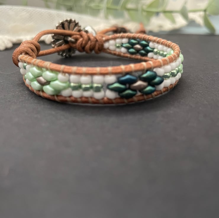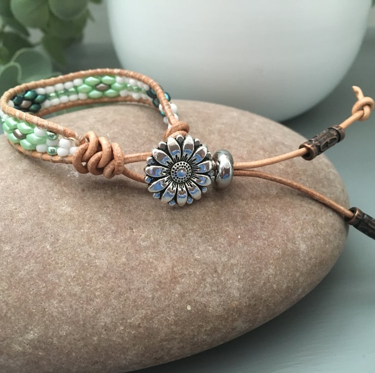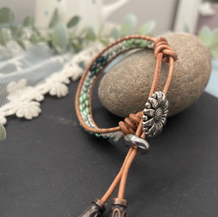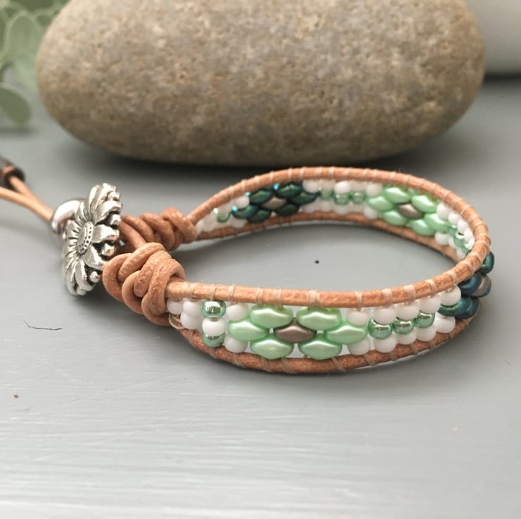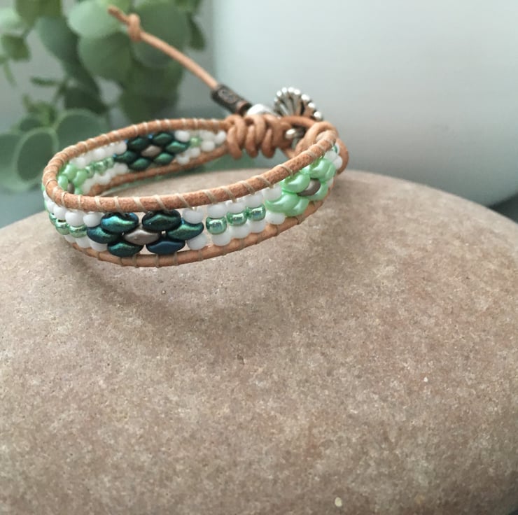 In Spring tones of green and white ,this bracelet is designed to wrap around the wrist once, but would look fantastic stacked with other bracelets for that boho look. Extremely easy to wear light weight and versatile. Would look great with a casual pair of jeans or dressed up with a pretty floral summer dress.