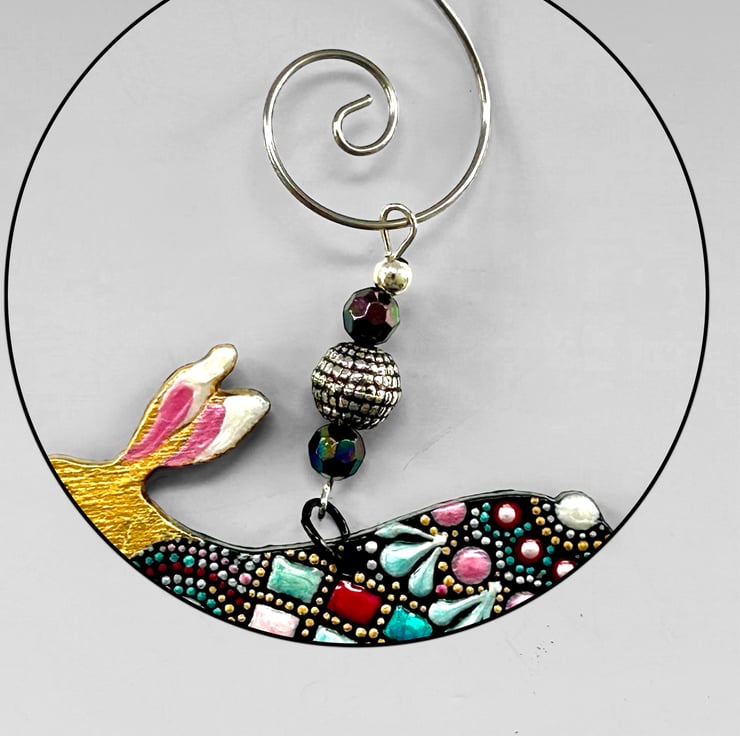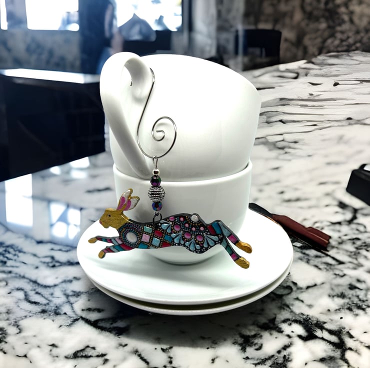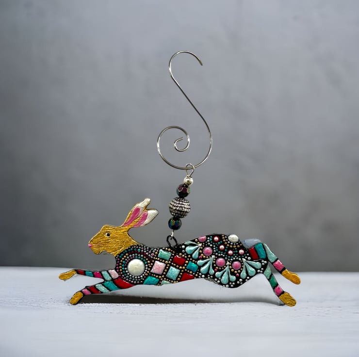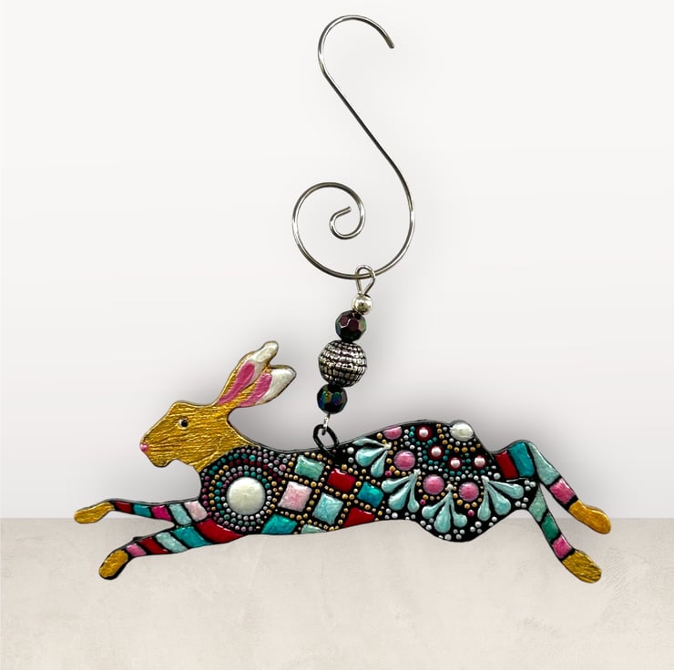 4" x 1.5" This Running Hare is laser cut from 3mm Birch Plywood and hand-painted in a multicoloured Mandala design. Four beads have been attached to form a dangle.