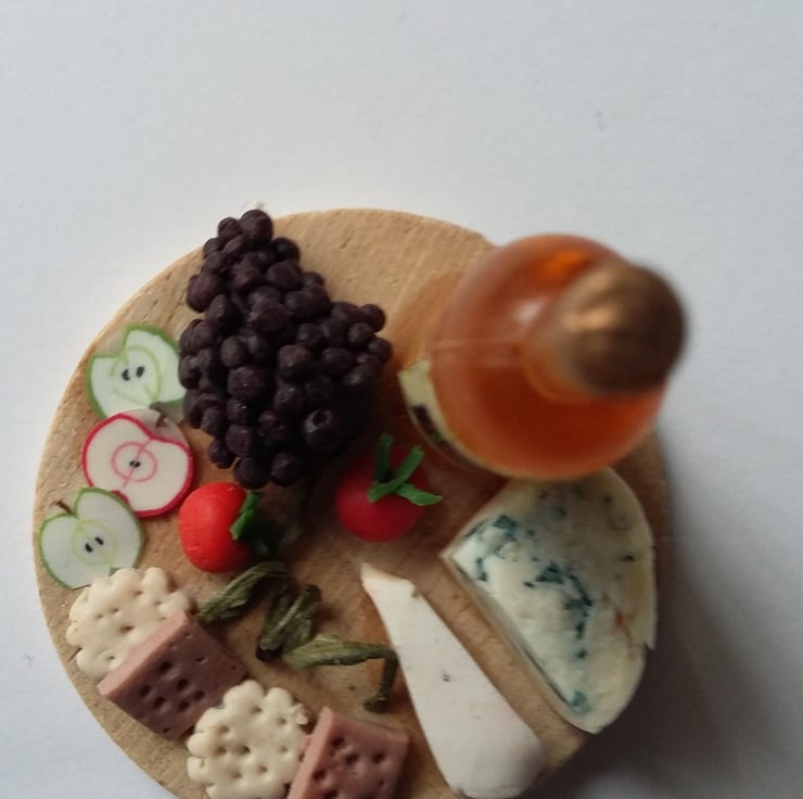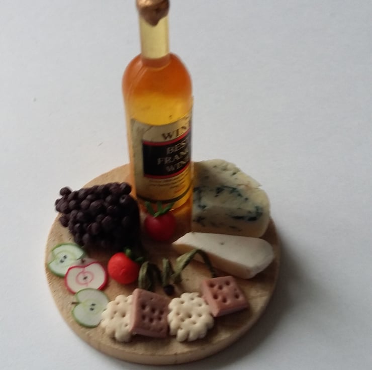 A 1.12TH SCALE WOODEN PLATTER WITH A SELECTION OF CHEESES, BLACK GRAPES,CRACKERS AND A WINE BOTTLE