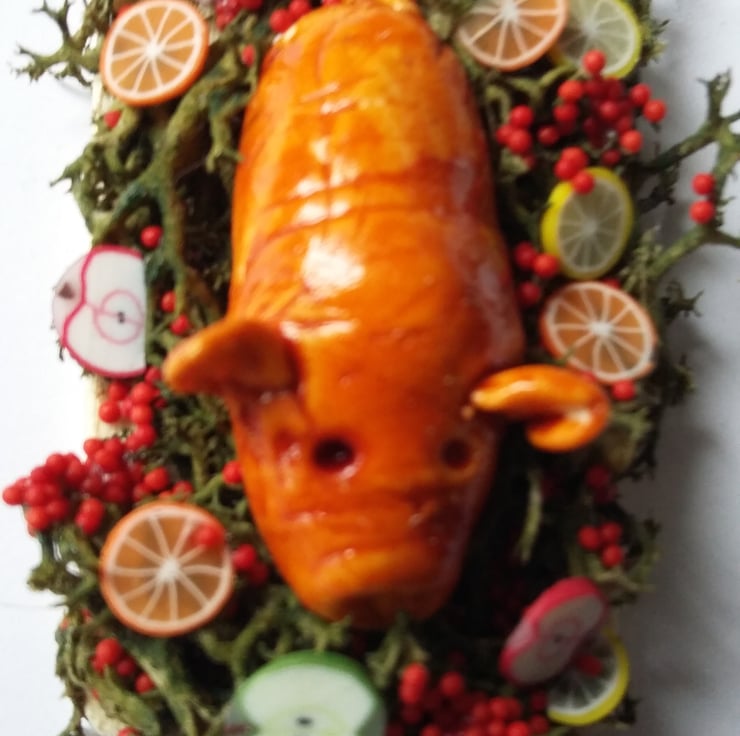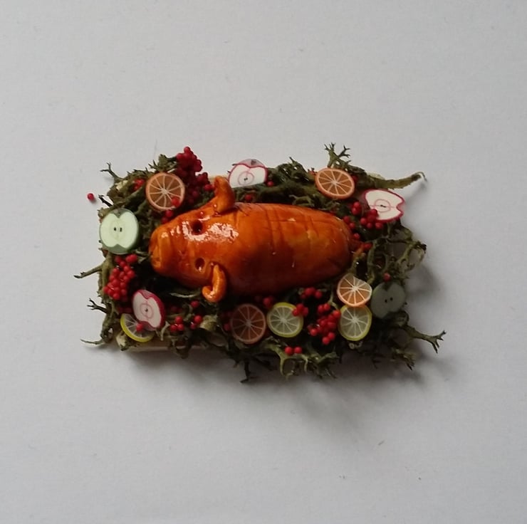 A 1,12TH TUDOR STYLE SUCKLING PIG ON A WOODEN BOARD