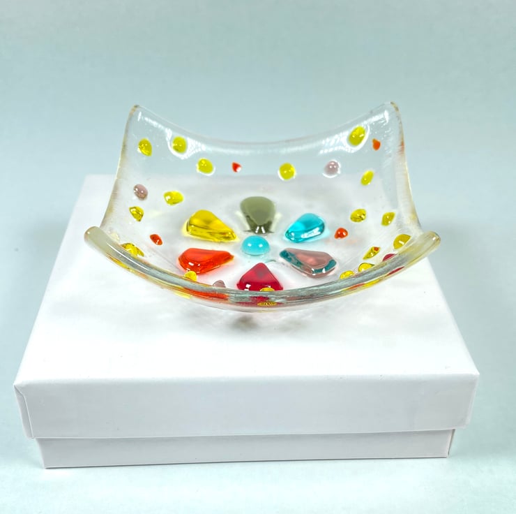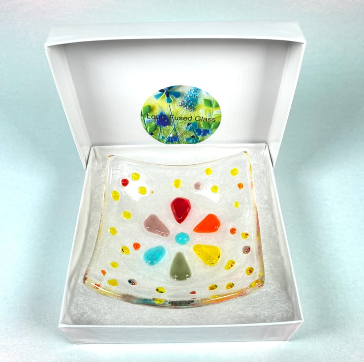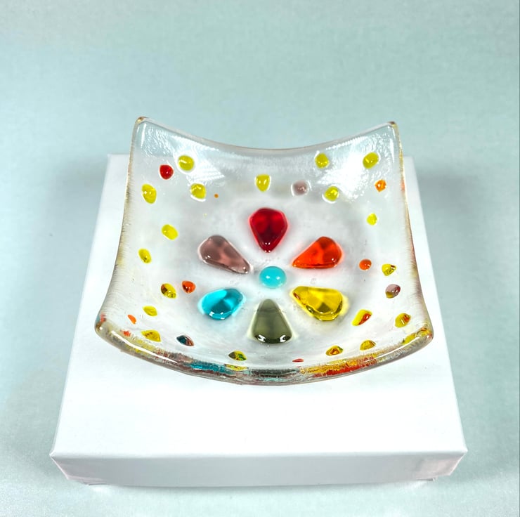 So pretty this colourful flower is made up of chakra rainbow colours and is pretty as both an ornament and a functional pretty little fused glass trinket dish . The dish measures approximately 3.5 inches and is fused twice in my kiln to give it the gentle curved shape .
