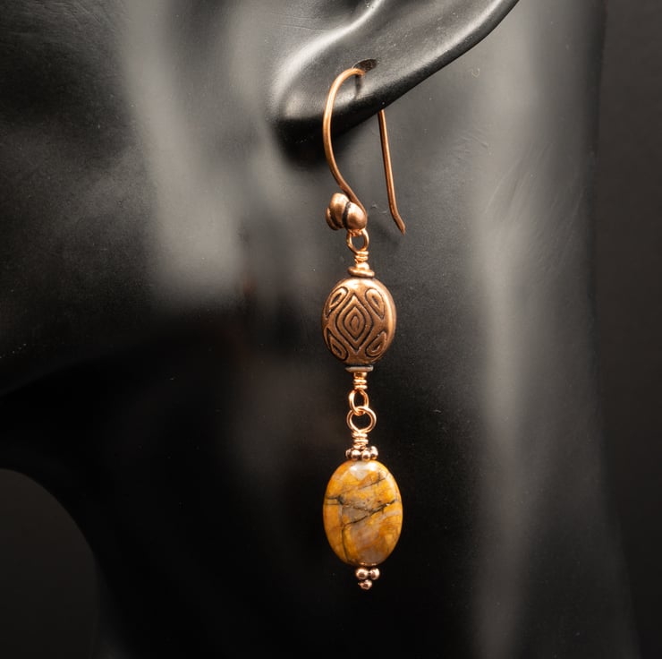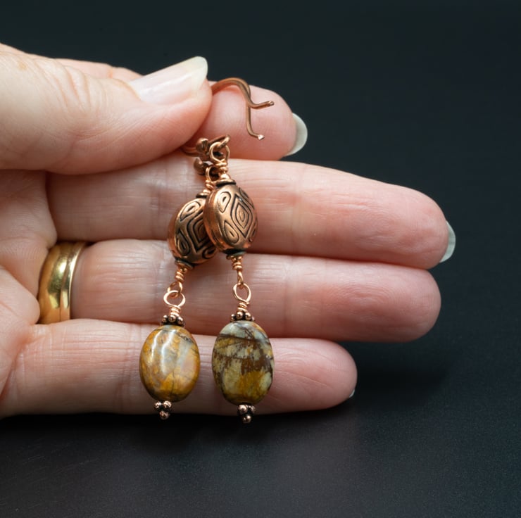 Earthy coloured Picasso jasper flat oval 14 x 10 beads and a handmade engraved Indian copper bead are linked together with pure copper wire copper. Ear wires are copper hooks. The beads are accented with small copper spacers.