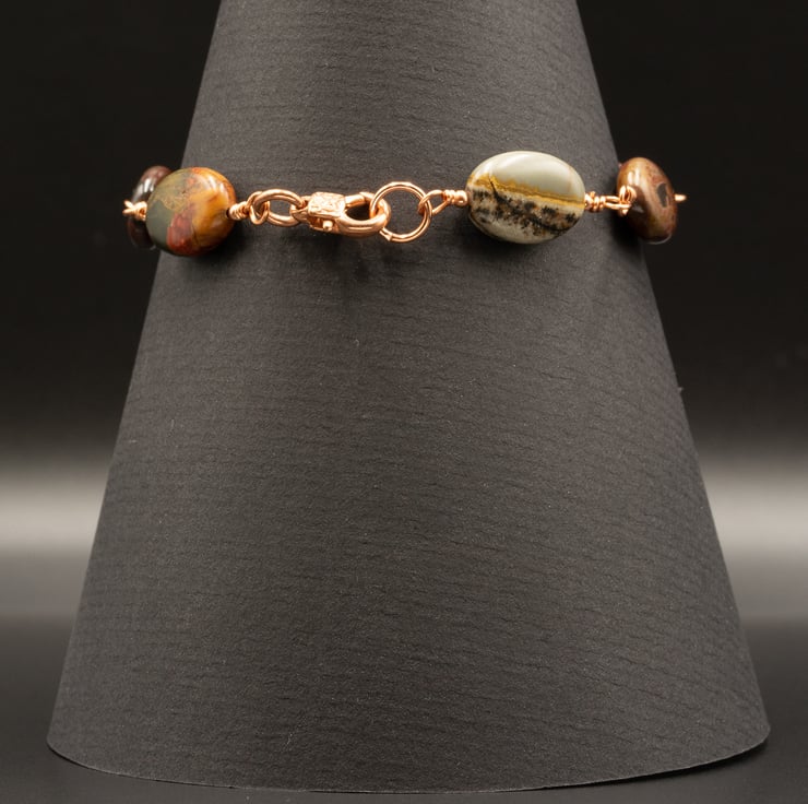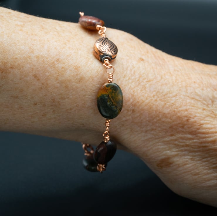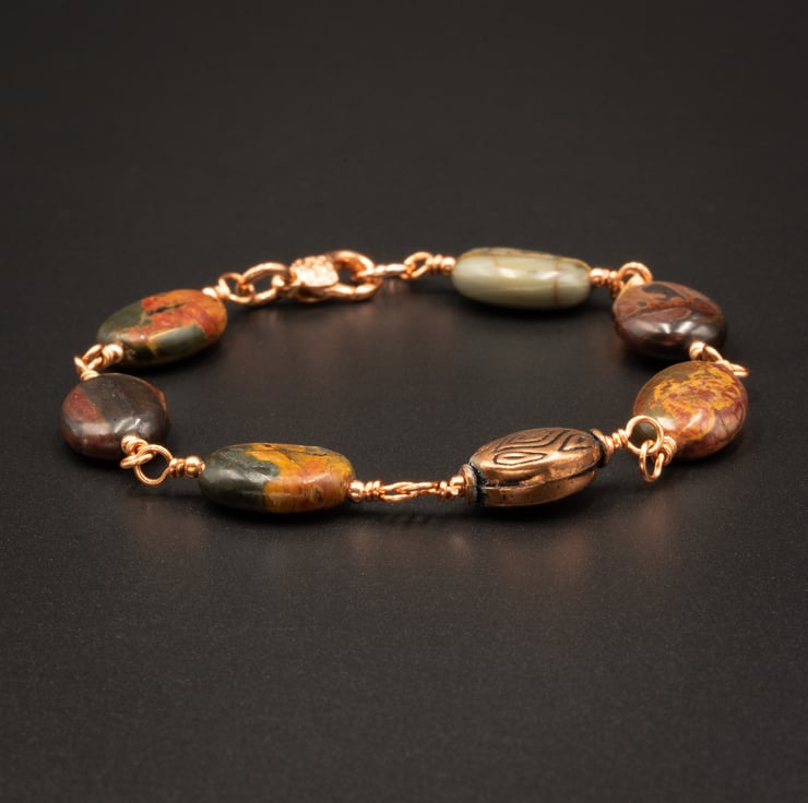 14 x 10mm oval beads of earthy picasso jasper are hand wrapped onto individual links of pure copper wire to create this dainty bracelet. Lovely marking on these stones. The central bead is a handmade engraved Indian copper bead.